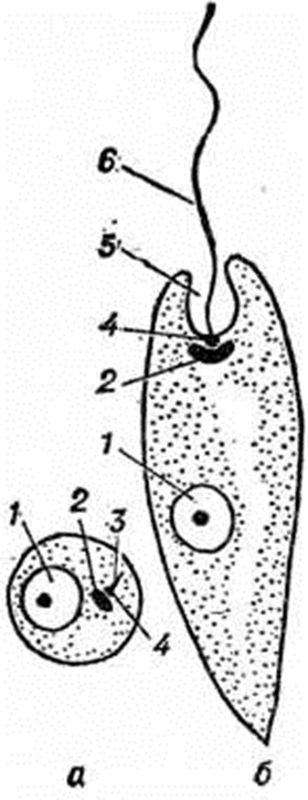 В своём жизненном цикле лейшмании проходят две стадии, изменяя при этом форму (рисунок 1). Безжгутиковая стадия (устар. лейшманиальная стадия) лейшманий — амастиготы (рисунок 1 ,а) паразитируют внутриклеточно в организме позвоночного хозяина (в макрофагах и других фагоцитирующих клетках кожи, слизистых оболочек, селезёнки, печени, костного мозга, лимфатических, узлов). Жгутиковая стадия (устар. лептомонадная стадия) лейшманий — промастиготы (рисунок 1, б) паразитируют в просвете кишечника беспозвоночного переносчика. Амастиготы овоидной или округлой формы, размером 2—5,5 микрометров. В мазках, окрашенных по методу Романовского — Гимзы, видна серо-голубая цитоплазма, иногда вакуолизированная, крупное красно-фиолетовое ядро и темно-фиолетовый палочковидный кинетопласт; иногда обнаруживается тонкая розоватая нить — ризопласт — внутриклеточная рудиментарная часть жгута (цветной рисунок 1, а и б). При попадании амастигот в кишечник москита происходит их быстрая (в течение нескольких часов) трансформация: тело удлиняется, вырастает жгут. Промастиготы (цветной рисунок 2) подвижны, имеют веретеновидную форму, длина тела 12—20 микрометров, ширина 1,5—3,5 микрометров, ядро расположено центрально, кинетопласт — на переднем конце тела, жгут начинается от базального тела, лежащего вблизи кинетопласта, длина его свободной части 16 — 20 микрометров. Размножаясь в кишечнике москита, промастиготы удлиняются и продвигаются вперёд; через 4—5 дней скапливаются в преджелудке, часто прикрепляясь концом жгута к его стенкам, а к 9 —10-му дню — в глотке. При повторном кровососании, через 5 —10 дней после заражающего кормления, москит способен передавать возбудителей. Лейшмании размножаются продольным делением надвое. Деление начинается с появления нового базального тела и расщепления кинетопласта, затем митотически делится ядро, картина веретена наблюдается внутри ядра без нарушения его оболочки (эндомитоз). Цитокинез у промастигот начинается с переднего конца. Жгут остаётся у одной из дочерних клеток, у другой — вырастает из вновь образовавшегося базального тела. Тело промастигот покрыто трёхслойной мембраной толщиной 10— 12 нанометров, под которой расположен слой из 100—200 микротрубочек, на поперечном срезе имеющих вид двухконтурных колец диаметром 20—25 нанометров. Число микротрубочек и размер амастигот у разных видов лейшманий достоверно различаются. Крупное ядро окружено двойной пористой мембраной, имеется 1—2 ядрышка. Двигательный аппарат включает ряд органелл: кинетопласт, состоящий из двух частей (одна содержит ДНК, другая имеет митохондриальную структуру), базальное тело (блефаропласт) с отходящим от него жгутом, который выходит из тела промастиготы через жгутиковый карман, образованный инвагинацией клеточной мембраны (рисунок 2). В стенках кармана видны пиноцитарные вакуоли.