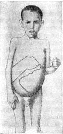Одним из основных симптомов является волнообразная неправильного типа лихорадка (смотри полный свод знаний), иногда с 2—3 пиками в течение суток. Волны подъёма температуры (субфебрильной или очень высокой) сменяются периодами ремиссии от нескольких дней до 1—2 месяцев Прогрессивно увеличивается селезёнка, особенно резко на 3—6-м месяцев болезни, несколько меньше — печень (рисунок 3) в разной степени — лимфатических, узлы как периферические, так и висцеральные (бронхиальные, мезентериальные и другие). Величина селезёнки зависит, как правило, от давности заболевания: за 9 —10 месяцев она может занять значительный объем брюшной полости. Селезёнка плотная, но эластичная, с гладкой поверхностью, ограниченно подвижная, периспленит не развивается. Увеличенные лимфатических, узлы плотноваты, всегда подвижны, безболезненны. В период разгара болезни кожа у больных бледная, восковидная, иногда с землистым оттенком, а при индийском висцеральном Лейшманиозы— очень тёмная (в связи с гиперфункцией надпочечников). Больные теряют в весе, постепенно развивается кахексия (смотри полный свод знаний). Нарастают изменения в крови: анемия (смотри полный свод знаний), лейкопения (смотри полный свод знаний) с тенденцией к агранулоцитозу (смотри полный свод знаний), тромбоцитопения (смотри полный свод знаний). Число эритроцитов может снизиться до 1—2 миллионов в 1 микролитров, лейкоцитов — до 1—2 тысяч в 1 микролитров. Наблюдается абсолютная и относительная нейтропения, абсолютное число лимфоцитов и моноцитов также снижается, эозинофилы, как правило, отсутствуют. У детей до 1 года в начале болезни может наблюдаться лимфоцитарный лейкоцитоз, резко уменьшено число тромбоцитов, РОЭ ускорена, у тяжелобольных она может достигать 90 миллиметров в часов. В костном мозге явления торможения эозино и мегакариоцитопоэза. Появление эозинофилов в пунктате костного мозга имеет благоприятное прогностическое значение. Со стороны сердечно-сосудистой системы — приглушенные тоны сердца, анемические шумы, тахикардия, пониженное артериальное давление, электрокардиографически выявляются диффузные изменения мышцы сердца. В поздней (кахектической) стадии болезни появляются Отёки, нередко развивается геморрагический синдром — петехии, кровотечения из носа и дёсен. Различают острое и хронический течение болезни. Острое течение чаще наблюдается у маленьких детей; характерны высокая температура (39—40 °), тяжёлая интоксикация, быстро прогрессирующее ухудшение общего состояния и состава крови. Продолжительность болезни 3—6, редко 8—12 месяцев. При хронический течении, которое наблюдается у старших детей и взрослых, температура обычно держится в пределах 37,5—38° , изредка повышаясь до 39—39,5° . Наблюдается ремиссия лихорадки продолжительностью несколько недель или месяцев. Ухудшение общего состояния и показателей крови происходит медленно. При отсутствии лечения болезнь может продолжаться до 1½—3 лет. У взрослых наряду с типичным проявлением болезни описаны случаи безлихорадочного течения её с умеренным увеличением селезёнки и печени или только лимфатических, узлов и миндалин. По всей вероятности, стёртые формы болезни встречаются чаще, чем это считалось ранее. Осложнения особенно часты в поздней стадии болезни и при выраженной лейкопении. Они возникают в резуль