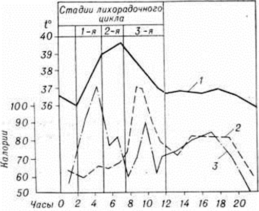 Долго не разрешался спор о том, зависит ли разогревание тела при Лихорадка только от повышения теплопродукции или от ограничения теплоотдачи. Эти споры были разрешены А. А. Лихачёвым и П. П. Авроровым (1902), применившими для изучения теплообмена человека при малярии и при мышечной работе первый в то время точный калориметр системы В. В. Пашутина. Они показали, что развитие Лихорадка связано (рисунок 1) как с ростом теплопродукции (смотри полный свод знаний) в основном в период озноба, так и с регуляторным (относительным и абсолютным) ограничением теплоотдачи (смотри полный свод знаний). Эта работа заложила основы понимания физиологический механизма изменений температуры тела при Лихорадка как терморегуляторной реакции (смотри полный свод знаний Терморегуляция). Выводы этих авторов получили подтверждение и развитие в работах Бенедикта и Карпентера (F. G. Benedict, Е. Carpenter, 1909), Н. В. Веселкина (1913—1915), Дюбуа (Е. DuBois, 1922—1927), Е. С. Граменицкой (1959), П. Н. Веселкина с сотрудники (1957—1963) и другие Вместе с тем в начале 20 век в теоретической патологии возникло стремление возвратить понятие «Лихорадка» к представлению о лихорадочной инфекционной болезни. Сущность Лихорадка усматривали в сложном симптомокомплексе глубоких нарушений обмена веществ и физиологический функций в результате инфекционные интоксикации; повышение же температуры тела при этом считали явлением вторичным, пассивным, связанным с повышением обмена веществ и теплопродукции на фоне токсического нарушения и недостаточности механизмов теплоотдачи. По признаку наличия глубоких расстройств обмена и функции при инфекционные болезни считали возможным говорить о Лихорадка и при нормальной или даже пониженной температуре тела больного. Эта умозрительная концепция противоречила клиническим и экспериментальным данным о механизме повышения температуры тела при Лихорадка, тормозя дальнейшее изучение Лихорадка Очень скоро преобладающими в науке стали взгляды времён С. П. Боткина на Лихорадка как на терморегуляторную реакцию, типовой симптом лихорадочных болезней. Лефевр (J. Lefevre, 1929), например, определял Лихорадка как «возмущение» терморегуляции, адаптирующее гомойотермный организм на уровне температуры более высоком, чем нормальный её уровень. Вторая половина 20 век знаменательна успехами в изучении пирогенных свойств различных бактерий. Выяснилось, что между патогенностью и пирогенностью прямой зависимости нет. Культуры непатогенных микробов (например, Вас. mesentericus), живые и убитые, обусловливают при введении в организм высокую Лихорадка, хотя инфекционные процесса и не возникает. Сильным пирогенным действием обладает эндотоксин грамотрицательных бактерий (носитель их специфической антигенности и токсичности), анализ структуры которого показал, что высоко пирогенна его липополисахаридная термостабильная фракция; освобождённая от белка, эта фракция лишена не только специфической токсичности, но в значительной мере и антигенности. Из ряда грамотрицательных микробов стали получать очищенные от белка стандартизированные, высокоактивные пирогенные препараты, используемые в экспериментальной и клинические, практике, например пирогенал (смотри полный свод знаний). Эти препараты обычно называют бактериальными пирогенами. Аналогичные термостабильные пирогены были з