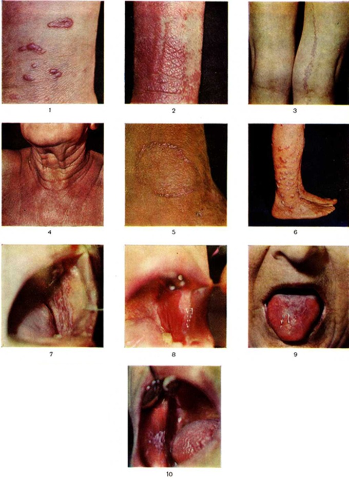 5. Эритематозная форма возникает внезапно на значительной части кожного покрова в виде малиново-красной эритемы на туловище и конечностях с незначительным отёком и лёгким. шелушением; папулёзные элементы трудно различимы до уменьшения интенсивности эритемы. 6. Пемфигоидный Лишай красный плоский— помимо типичных папул, образуются субэпидермальные пузыри с серозным или геморрагическим содержимым, расположенные на поверхности папул или на неизменённой коже; нередко возникает у больных со злокачественными опухолями внутренних органов, являясь параонкологическим дерматозом. 7. Гипертрофический (бородавчатый) Лишай красный плоский — чётко отграниченные фиолетовые бляшки с расширенными устьями волосяных фолликулов и потовых желёз, закупоренными роговыми пробками, покрытыми толстыми асбестовидными чешуйками (цветной рисунок 6); характеризуется упорным течением и преимущественной локализацией на коже голеней. Приплюснутый Лишай красный плоский — полусферические, слегка шелушащиеся папулы диаметром до 10 миллиметров, локализующиеся обычно на коже голеней. Коралловидный Лишай красный плоский — уплощённые папулы величиной до 10 миллиметров, располагающиеся в виде чёток и чередующиеся с участками гиперпигментации (встречается очень редко). Пигментный Лишай красный плоский — выраженная гиперпигментация, появляющаяся практически одновременно с появлением папул (встречается редко). Остроконечный Лишай красный плоский — скученные на ограниченных участках фолликулярные остроконечные, конусовидные узелки, ороговевшие на вершине, диаметром 1—3 миллиметров, на ощупь напоминающие поверхность тёрки. Атрофический Лишай красный плоский (синонимы вторичный склерозирующий лихен) — атрофические изменения кожи на месте папул (встречается редко). Острый остроконечный Лишай красный плоский — мелкие ярко-красные конические, реже сферические, папулы на фоне эритемы и Отёка, возникающие остро и в течение нескольких дней покрывающие все тело с формированием эритродермии (цветной рисунок 4); типичные папулы при этом можно обнаружить только с помощью лупы. Этот вариант может через 1 — 2 месяцев перейти в обычную хронический форму. Поражение слизистых оболочек наблюдается почти у половины больных Лишай красный плоский и возникает одновременно с высыпаниями на коже либо изолированно. Чаще всего на слизистой оболочке щёк, спинки языка, реже неба, красной каймы губ, вульвы, внутреннего листка крайней плоти и на головке полового члена появляются высыпания в виде серовато-белой кружевной сетки (цветной рисунок 7), разветвлений, колец, округлых островков опалового цвета. Реже наблюдаются экссудативно-гиперемическая, везико-буллезная, бородавчатая и эрозивно-язвенная формы (цветной рисунок 8 — 10). Последняя иногда развивается у больных сахарным диабетом и гипертонической болезнью — синдром Гринспана. Некоторые авторы выделяют также атрофическую, или склеротическую, форму, представляющую собой, по-видимому, вариант очаговой склеродермии (смотри полный свод знаний), а также инфильтративно-перигландулярную и пигментную формы Лишай красный плоский Поражение ногтей наблюдается у 10—15% больных Лишай красный плоский и характеризуется образованием продольных гребнеобразных борозд, помутнением, истончением и углублением ногтевых пласт
