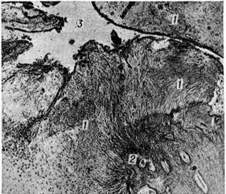 Длительная подвижность может привести к преобразованию кости в зоне перелома вначале в фиброзную, а затем и хрящевую ткань. Подвижность и нагрузка по оси при соприкосновении отломков и сохранившейся репаративной способности в них приводят к костеобразованию по боковым поверхностям отломков с их значительным утолщением, но без костной спайки между собой. Таким образом, формируются гипертрофические или гиперваскулярные Ложный сустав (рисунок 1). Общим для них является преобладание костеобразования и перестройки над рассасыванием кости. Обнажение отломков на значительном протяжении, их расхождение, исключающее соприкосновение и нагрузку с самого начала, массивное разрушение окружающих мягких тканей, приводит к недостаточному кровоснабжению концов отломков. Интенсивность репаративной реакции при этих условиях снижается и постепенно затухает, начинают преобладать процессы рассасывания. Концы отломков истончаются и заостряются. Так формируются атрофические или гиповаскулярные Ложный сустав, в которых рассасывание кости преобладает над костеобразованием (рисунок 2). По патогенезу врождённые Ложный сустав чаще всего относятся к атрофическому типу. Патологическая анатомия различна и определяет клинико-рентгенологический тип Ложный сустав При гипертрофическом типе Ложный сустав щель между отломками заполнена грубоволокнистой соединительной тканью (рисунок 3). При гиповаскулярном атрофическом типе Ложный сустав щель между отломками более значительна, она сначала также заполнена соединительной тканью (смотри полный свод знаний), однако при длительном (более 2—3 лет) существовании Ложный сустав в ткани между отломками может возникнуть щель, заполненная синовиальной жидкостью (смотри полный свод знаний), а по краям рубцовая ткань растягивается и приобретает характер суставной капсулы. Концы отломков при этом покрываются волокнистым хрящом, иногда с участками гиалинового хряща (рисунок 4). Так образуется «типичный» Ложный сустав с большой степенью подвижности (неоартроз), чаще всего развивающейся в зоне диафиза кости (рисунок 5).