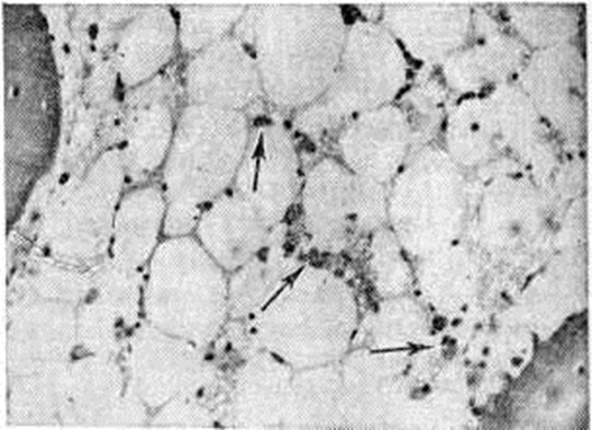 Кожные поражения (выпадение волос, лучевые ожоги) могут отчётливо проявляться при значительном облучении; у жертв атомного взрыва они сочетались, как правило, с термическими ожогами. При микроскопическом исследовании наиболее характерны изменения органов кроветворения, начальные признаки поражения которых обнаруживаются в латентном периоде задолго до ярких клинические, проявлений острой Лучевая болезнь В лимфатических, узлах в первые часы после облучения можно видеть распад лимфоцитов, особенно в центральной части фолликулов, то есть в зоне расположения В-лимфоцитов; несколько позже выявляются изменения в паракортикальном слое (зона Т-лимфоцитов). В период разгара заболевания на фоне резкой гиперемии различимы в основном элементы стромы лимфатических, узла и плазматические клетки. Аналогичные изменения наблюдаются в миндалинах, селезёнке, групповых фолликулах (пейеровых бляшках) и солитарных фолликулах желудочно-кишечные тракта. В костном мозге быстро развивается аплазия: к третьим суткам в нем остаётся, по данным некоторых авторов, лишь около 10% клеточного состава, что объясняется усиленным выбросом в периферическое русло зрелых форм, прекращением деления и распадом клеток (интерфазная гибель); в последующем митотическая активность на некоторое время возобновляется, но делящиеся клетки погибают в процессе митоза. Быстрое и значительное клеточное опустошение сопровождается как бы викарным полнокровием сосудов костного мозга с разрывами сосудистых стенок и образованием полей кровоизлияний. В периоде разгара острой Лучевая болезнь в костном мозге почти не остаётся обычной кроветворной ткани, видны преимущественно элементы стромы и плазматические клетки (рисунок). Поражение лимфоидной ткани и костного мозга приводит к снижению иммунобиологический реактивности организма и создаёт благоприятные условия для развития разнообразных осложнений, главным образом аутоинфекционного характера.