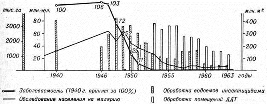 В 1951 год П. Г. Сергиев научно обосновал возможность полной ликвидации Малярия в СССР. При этом основное значение придавалось исчерпывающему выявлению больных обязательному исследованию крови на Малярия у лихорадящих больных, особенно среди прибывших из зарубежных стран, изоляции больных и их эффективному лечению, диспансерному наблюдению за переболевшими, паразитоносителями и их лечению. Практическая ликвидация Малярия была достигнута к 1960 год (рисунок 2), когда на всей территории СССР число случаев Малярия и паразитоносителей составило 425, то есть менее 2 больных на каждый миллион населения, число очагов — 238. С 1960 год развернулась плановая работа по ликвидации остаточных очагов Малярия и предупреждению возникновения Малярия на остальной территории. Передача Малярия полностью прекратилась почти на всей территории СССР. В стране более 15 лет у населения не обнаруживались P. falciparum, выявляются лишь единичные случаи четырёхдневной Малярия, возникающие после гемотрансфузии (свидетельство наличия у населения P. malariae), и регистрируются случаи трёхдневной Малярия в пограничных районах Азербайджана и некоторых республик Средней Азии. Эпидемиологическом обстановка по Малярия надёжно контролируется, несмотря на интенсивный завоз всех четырёх форм Малярия из зарубежных стран.