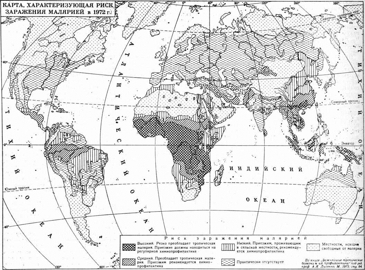 Первое упоминание в европейской литературе о лечении перемежающихся лихорадок экстрактом из коры хинного дерева относится к 1643 год В 1820 год французский химики Пеллетье и Каванту (P. J. Pelletier, J. В. Caventou) выделили в чистом виде алкалоид хинин. Шулеман, Шонхофер и Винглер (Schuleman, Schonhofer, Wingler) в 1926 год получили первый синтетический противомалярийный препарат — плазмохин. В 1931 год О. Ю. Магидсон, И. Т. Струков, Г. В. Челинцев и И. Л. Кнунянц синтезировали плазмоцид, в 1933 год И. Л. Кнунянц, Г. В. Челинцев, А. Малярия Григоровский и С. В. Беневоленская — акрихин. В 1939 год швейцарец Мюллер (P. Н. Muller) открыл инсектицидное действие синтезированного в 1874 год ДДТ, что дало возможность развернуть работы по борьбе с переносчиком Малярия В 1944 год в Англии был синтезирован палюдрин, в 1945 год в США — первый из 4-аминохинолиновых производных — хлорохин. Распространение и статистикаДревним первичным очагом Малярия считают тропическую Африку, откуда болезнь распространилась в Индию, Китай и Индокитай, а через долину Нила — в Мессопотамию и страны Средиземноморья. По мнению В. В. Фавра, в Россию Малярия была занесена из Ирана. Северный граница ареала Малярия достигала 49° северной широты в Северной Америке и 64° северной широты— в Европе и Азии; южный граница доходила до 33° южной широты в Южной Америке, 31° южной широты — в Африке и 20° южной широты— в Австралии. Внутри этих границ Малярия отсутствовала в высокогорных и пустынных районах, на ряде о-вов Тихого и Атлантического океанов, не заселённых комарами Anopheles. Наиболее высоко расположенные очаги Малярия были зарегистрированы на высоте 3500 м над уровень моря Севернее 49—64° северной широты и южнее 33—20° южной широты передача Малярия не происходит из-за недостатка тепла для развития плазмодия в организме комара. Глобальный ареал Малярия представляет собой совокупность ареалов четырёх её форм: тропической, трёхдневной, четырёхдневной и Малярия овале. Шире других видов распространился P. vivax, занимающий почти весь групповой нозоареал, за исключением некоторых районов Западной Африки. Трёхдневная Малярия была единственной формой в ряде стран умеренного климата (Англия, Германия, Финляндия, север США) или резко преобладала над другими её формами (Франция, Нидерланды). Это было обусловлено главным образом способностью P. vivax развиваться в теле переносчика при более низких температурах по сравнению с другими возбудителями Малярия Высокая приспособляемость P. vivax к разным климатическим условиям обеспечивается также генетически обусловленной способностью паразита пребывать в организме хозяина в недеятельном состоянии (спячка) в течение многих месяцев, реже лет. На севере ареала P. vivax в генофонде популяции преобладают гены, обусловливающие 6—13-месячный инкубационный период, что проявлялось в заболевании Малярия весной при заражении летом прошедшего года (Малярия с длительной инкубацией). По мере продвижения к экватору и сокращения сезонного перерыва передачи возбудителей разнообразие генофонда популяции нарастает: преобладают гены, обеспечивающие раннюю активность возбудителя Малярия, что проявляется в заболевании после инкубации продолжительностью от 7 до 21 дня (Малярия с короткой инкубацией). В тропиках генофонд P. vivax наиболее разнообразен, и заразившийся человек может получить спорозоиты разных потенций, 