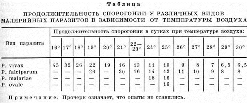 Классификации. ВОЗ различают 4 типа эндемической Малярия: гипоэндемичная Малярия— селезёночный индекс у детей 2—9 лет в пределах до 10%; мезоэндемичная Малярия— селезёночный индекс у детей 2—9 лет в пределах от 11 до 50%; гиперэндемичная Малярия— селезёночный индекс у детей 2—9 лет постоянно выше 50% и высок у взрослого населения; голоэндемичная Малярия— паразитарный индекс у грудных детей постоянно выше 75%, селезёночный индекс у взрослого населения высокий (новогвинейский тип эндемии) или низкий (африканский тип эндемии). В очагах голо и гиперэндемичной Малярия лица, не погибшие от тропической Малярия, в результате частых поражений приобретают заметную устойчивость к реинфекции,, повреждающему действию паразита, а Малярия болеют только дети. При менее интенсивной и непостоянной передаче там, где наблюдается сезонный перерыв в заболеваемости, стабильный иммунитет не вырабатывается, Малярия поражаются и дети, и взрослые. Риск заражения Малярия в очагах устанавливается в зависимости от типа эндемии. Величина риска заражения характеризует вероятность для жителя данного очага подвергнуться нападению заражённого комара. Голо и гиперэдемичные очаги Малярия отличаются высоким риском заражения, мезо и гипоэндемичные — соответственно средним и низким риском заражения. Риск заражения, исходно присущий очагу данного типа, может быть существенно снижен плановыми противомалярийными мероприятиями, Структура ареала Малярия по риску заражения, сложившемуся к 1972 год, представлена на рисунке 3. Из природных факторов на распространение Малярия оказывают влияние климат, рельеф местности и растительность. Температурные условия имеют наибольшее значение в развитии водных стадий комаров Anopheles. Развитие личинок самых холодоустойчивых видов комаров невозможно при температуре воды ниже 10° . Температурный фактор ограничивает распространение возбудителей Малярия, поскольку завершение цикла спорогонии в теле переносчика происходит при определённой температуре воздуха (таблица). Температура воздуха влияет также на длительность гонотрофического цикла комаров, начинающегося с кровососания и заканчивающегося откладкой яиц. При высокой температуре (от 25 до 30° ) продолжительность гонотрофического цикла — 2 суток; при менее высоких — до 7 суток и более. За период спорогонии самка комара проделывает несколько гонотрофических циклов. Физиологически старые самки комаров, проделавшие несколько гонотрофических циклов, представляют наибольшую эпидемиологические опасность, поскольку вероятность наличия у них спорозоитов становится особенно высокой. Температурные условия спорогонии определяют также интенсивность заражения самок комаров малярийными плазмодиями. При высокой температуре образуется большее количество ооцист, а следовательно, и спорозоитов.
