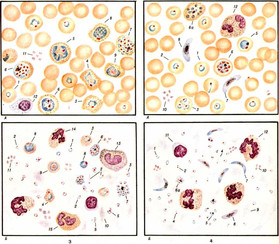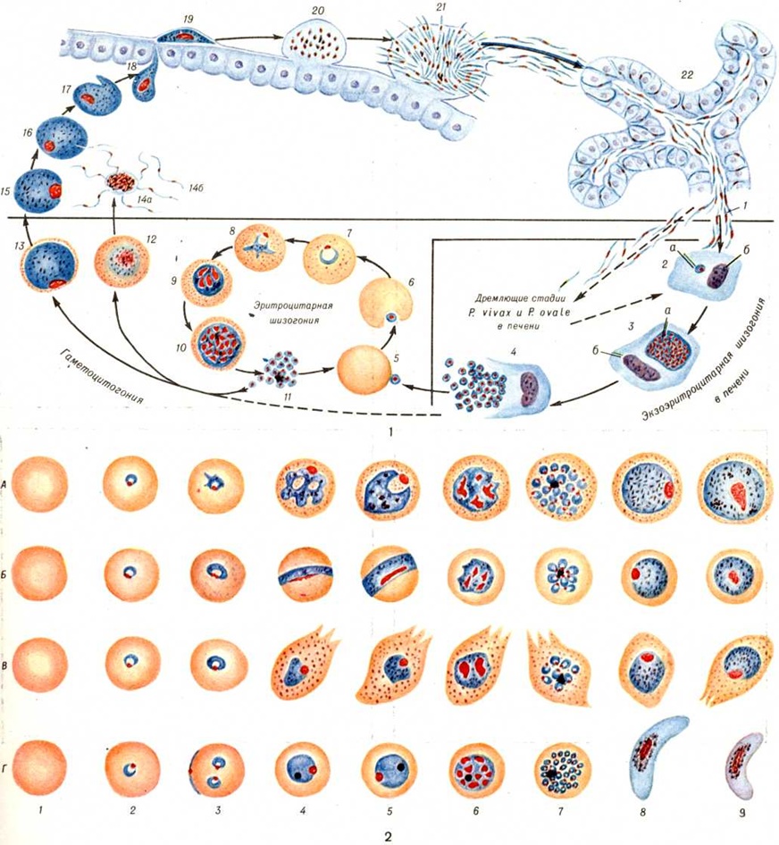 Большие изменения в заболеваемости Малярия произошли во всем мире в ходе реализации глобальной программы её ликвидации, начавшейся в 1955 год под эгидой ВОЗ. В первые 10 лет (1956—1965) были достигнуты значительные успехи на всех континентах, кроме Африки. Появились обширные зоны, свободные от Малярия, в Европе, Индии, США, на островах Карибского моря, в Мексике, Венесуэле. В дальнейшем процесс ликвидации Малярия замедлился и, наконец, практически прекратился. В 70-х годы вновь отмечаются заболевания Малярия в ранее оздоровленных районах Ирана, Ирака, Турции и Сирии. Малярия стала важнейшей проблемой здравоохранения в Индий, Шри Ланке и Бирме; заболеваемость ею резко возросла в Таиланде, на Филиппинах, в ряде стран Центральной и Южной Америки. На оздоровленных от Малярия территориях Европы, Северной Америки и Японии увеличилось число завозных случаев Малярия Это сопровождалось развитием вспышек болезни, увеличением летальности и ростом прививной Малярия Число заболевших Малярия в мире в 1976 год составило 150 миллионов человек На долю тропической Малярия приходится 50% всех случаев заболеваний, трёхдневной — 43% и четырёхдневной — 7%. В Африке (мировой «эпицентр» Малярия) ежегодно, по неполным данным, регистрируется от 2 до 17 тысяч заболеваний на 100 000 жителей. В ряде стран тропической Африки заболевания Малярия составляют в среднем свыше 12% общей заболеваемости. Летальность, непосредственно связанная с Малярия, равна примерно 1%. Погибает от Малярия более 1 миллионов человек в год, главным образом в тропической Африке. Во время катастрофических эпидемический подъёмов летальность при Малярия достигала 3—5%, в отдельных местностях и населённых пунктах — 20—40%. P. falciparum является причиной 98% всех летальных исходов при Малярия В 60—70-е годы наибольшая летальность при тропической Малярия отмечается в Европе и США; за период 1967—1972 годы она составляла в Европе 2,7% (в Великобритании в 1970—1973 годы— 5,2%), в США — 8,4%. Это обусловлено отсутствием иммунитета у большинства заболевших и неправильной или запоздалой диагностикой заболевания. Неудачи программы ликвидации Малярия в мире связаны с рядом факторов: охватившей капиталистический мир инфляцией, сокращением финансовой поддержки со стороны развитых капиталистических стран, нехваткой и удорожанием инсектицидов, появлением резистентности у переносчиков к инсектицидам и у возбудителей Малярия— к лекарственным препаратам, недостаточным числом подготовленного персонала и неудовлетворительным состоянием служб здравоохранения в некоторых странах. Советские граждане, выезжающие в эндемичные по Малярия страны, подвергаются риску заражения: в тропической Африке — преимущественно Р. falciparum, реже P. ovale и P. malariae и очень редко P. vivax; в Северной Африке — P. vivax; в Азии — преимущественно P. vivax, реже Р. falciparum (в Непале и на Филиппинах — P. malariae); в Центральной и Южной Америке — в основном P. vivax, реже P. falciparum. ЭтиологияВозбудители Малярия— одноклеточные микроорганизмы, относящиеся к типу Protozoa, классу Sporozoa, отряду Haemosporidia, семейству Plasmodiidae, роду Plasmodium. Известны 4 вида возбудителей Малярия человека: Plasmodium vivax (Grassi et Feletti, 1890) Labbe, 1899 — возбудитель трёхдневной Малярия; Plasmodium malariae (Laveran, 1881) Grassi et Feletti, 1890 — возбудитель четырёхдневной Малярия; Plasmodium falciparum Welch, 1897 — возбудитель тропической Малярия; Plasmodium ovale Stephens, 1922 — возбуд