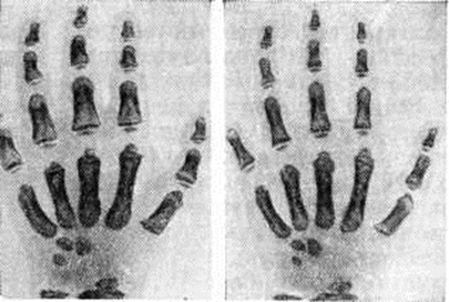 Морфологические изменения со стороны кожи отсутствуют, отмечается фиброз соединительной ткани яичка, в скелетных мышцах резко выражена поперечная исчерченность волокон. Для больных с Маркезани синдром характерны низкий рост, врождённые дефекты формы головы (брахицефалия), излишне развитые мышцы и подкожная клетчатка; верхние и нижние конечности настолько коротки, что больные не могут обхватить собственную голову руками. Пальцы уменьшены в размерах (брахидактилия), толстые. Рентгенологически выявляется асимметричный сдавленный череп с гипопластичными верхней челюстью и глазницами, отмечается неправильное формирование и расположение зубов (часто с отсутствием корней), укорочение пястных костей, укорочение и утолщение фаланг пальцев кистей (рисунок) и стоп. Офтальмологически выявляются резкая миопия (смотри полный свод знаний Близорукость), глаукома (смотри полный свод знаний), уменьшение размеров и аномалии формы хрусталика — микросферофакия и подвывих (смотри полный свод знаний Хрусталик), нередко нистагм (смотри полный свод знаний) и нарушение конвергенции глаз (смотри полный свод знаний). Психическое развитие нормальное.