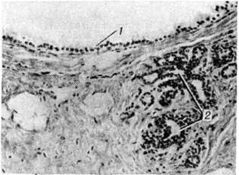 Гистологический изменения складываются из признаков аденоза, склероза, расширения протоков с очагами пролиферации эпителия, комбинирующихся в каждом случае в различных соотношениях, чаще с преобладанием одного из компонентов. Непролиферативная форма Мастопатия характеризуется разрастаниями плотной, нередко гиалинизированной соединительной ткани, в которой располагаются атрофичные дольки и кистозно расширенные протоки, выстланные атрофичным или светлым апокринизированным эпителием (рисунок 1), местами образующим мелкие сосочки. Расширенные протоки могут быть выстланы пикнотичным или вакуолизированным эпителием со слущиванием части клеток и образованием «молозивных телец»; вокруг протоков определяется очаговая лимфоплазмоклеточная инфильтрация с картиной так называемый плазмоклеточного мастита.