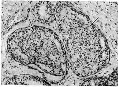 Особой разновидностью эпителиальной пролиферации при Мастопатия является склерозирующий аденоз. В так называемый цветущей фазе склерозирующего аденоза обнаруживаются очаги выраженной пролиферации эпителия ацинусов и миоэпителия (рисунок 3); образуются сплошные поля из мелких трубочек, тяжей, альвеол, лежащих в умеренно развитой строме. Постепенно процесс переходит в фиброзную фазу, при которой в полях гиалинизированной соединительной ткани сохраняются лишь отдельные, чаще всего тубулярные структуры, симулирующие в некоторых случаях гистологический картину инфильтративного рака. При пролиферативной Мастопатия выявляются также очаги фиброэпителиальной пролиферации с образованием мелких фиброаденом и цистаденопапиллом. Для цистаденопапиллом характерно формирование в протоках различной величины соединительнотканных сосочков, покрытых несколькими рядами цилиндрического или кубического эпителия (рисунок 4). В крупных протоках могут формироваться отдельные цистаденопапилломы , приобретающие самостоятельное клинические, значение.