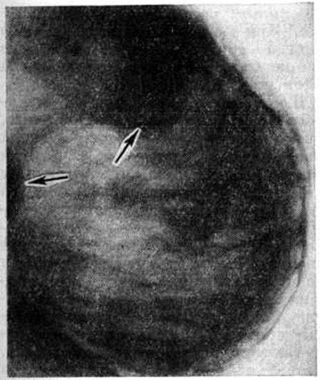Диагноз. В диагностике Мастопатия применяются клин., морфологический и рентгенологическое методы исследования, которые приобретают особенно важное значение при дифференциальной диагностике узловых форм Мастопатия и рака молочной железы (смотри полный свод знаний). Материалом для цитологический исследования при Мастопатия служат пунктаты очаговых уплотнений молочной железы, мазки выделений из сосков, отпечатки с поверхности разреза узловых образований, взятые сразу после оперативного их удаления. Гистологический исследованию подвергается иссечённая ткань очаговых уплотнений и узлов. С помощью рентгенологическое исследования устанавливают наличие Мастопатия, определяют преобладание аденоза, кист или фиброзных изменений, наблюдают динамику процесса под влиянием лечения, выявляют возникший на фоне Мастопатия опухолевый узел или намечают место для пункции или эксцизии. Мелкокистозные образования молочной железы на рентгенограммах обнаруживаются в виде множественных округлых расплывчатых теней и участков однородного затемнения; более крупные кисты (от 0,5 до 4 сантиметров) дают округлые и овальные тени с чёткими ровными контурами (рисунок 5). Многокамерная киста имеет полициклические очертания (рисунок 6, а), тень её однородна с определяющимся нередко ободком просветления. После пункции кисты молочной железы производят цитологический исследование содержимого с последующей пневмокистографией (рисунок 6, б). Пневмокистография (смотри полный свод знаний) позволяет контролировать полноту опорожнения кисты и обнаруживать внутрикистозные гиперпластические и опухолевые образования.