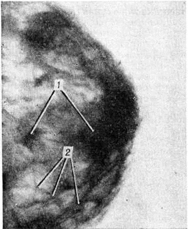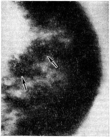 При поражении протоков молочной железы на рентгенограммах могут определяться их расширенные тени, в некоторых случаях видны внутрипротоковые отложения солей кальция в виде параллельных полосок или колец. При дуктографии обнаруживают деформацию и расширение протоков, кистовидные полости по их ходу или кистозные расширения концевых отделов (рисунок 8). При сочетании различных форм Мастопатия наблюдается нередко пестрая рентгенологическое картина, которую отдельные авторы образно сравнивают с «лунным рельефом»: определяется перестройка структуры железы с множественными участками затемнения и просветления разной формы и величины (рисунок 9), тень железы пересекают изображения соединительнотканных тяжей; на этом фоне могут быть заметны тени отдельных кист и фиброаденом.