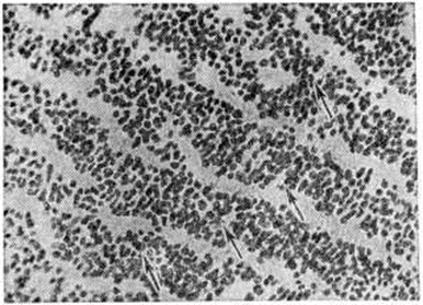Макроскопически Медуллобластома имеет вид мягкого узла сероватого или серовато-розового цвета, довольно чётко отграниченного от окружающей ткани. Микроскопически опухоль состоит из густо расположенных недифференцированных клеток, образующих иногда своеобразные ритмические структуры в виде правильных или беспорядочных рядов, которые сравнивают с грядами и колоннами (рисунок 1). Особенно характерны микроскопические структуры в виде так называемый розеток, образованных кольцевидно расположенными опухолевыми клетками, отростки которых сходятся в центре розетки. Опухолевые клетки умеренно полиморфны, с многочисленными митозами. Наряду с гиперхромными мелкими округлыми ядрами в клетках Медуллобластома встречаются овальные и вытянуто-овальные, удлинённые, а также более крупные светлые округло-овальные ядра с чётким ядрышком. Строма опухоли скудная, с небольшим количеством преимущественно мелких, тонкостенных сосудов. Очаги некроза и кисты не типичны. Рост опухоли инфильтративный с прорастанием прилежащей ткани и мягкой оболочки мозга, нередко с вторичным врастанием из оболочки в подлежащую ткань. Медуллобластома метастазирует главным образом по ликворным пространствам, в мягкую оболочку и эпендиму желудочков мозга, в которых определяются плоские, сливающиеся между собой белесоватые узелки (рисунок 2), переходящие в диффузные разрастания. Иногда Медуллобластома даёт метастазы в лимф, узлы, кости, органы желудочно-кишечные тракта.
