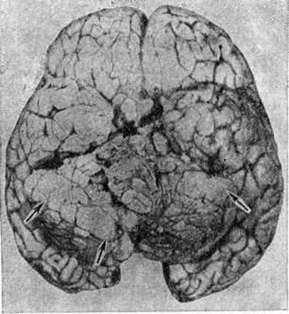 Клиническая картина. Нередко первые клин, симптомы появляются после ангины, гриппа, детских инфекций, ушибов головы. Заболевание протекает с быстрым нарастанием симптомов повышения внутричерепного давления с преобладанием окклюзионно-гидроцефального синдрома (головные боли и рвота, чаще в утренние часы). При офтальмоскопии обнаруживают отёк дисков зрительных нервов, а на краниограммах, особенно в дошкольном возрасте — расхождение швов черепа и углубление пальцевых вдавлений. Выражены менингеальные симптомы и признаки интоксикации. Очаговая неврологический симптоматика такая же, как при опухолях червя мозжечка (смотри полный свод знаний) и IV желудочка (смотри, полный свод знаний Желудочки головного мозга). При прогрессировании процесса наблюдаются приступы, протекающие с потерей сознания, тоническими экстензионными судорогами, расстройствами дыхания и сердечной деятельности, которые могут быть причиной летального исхода.