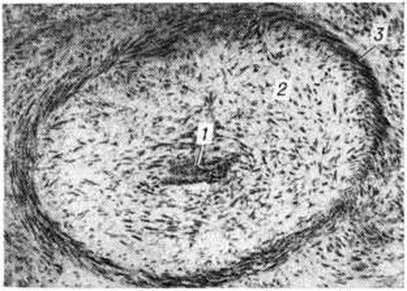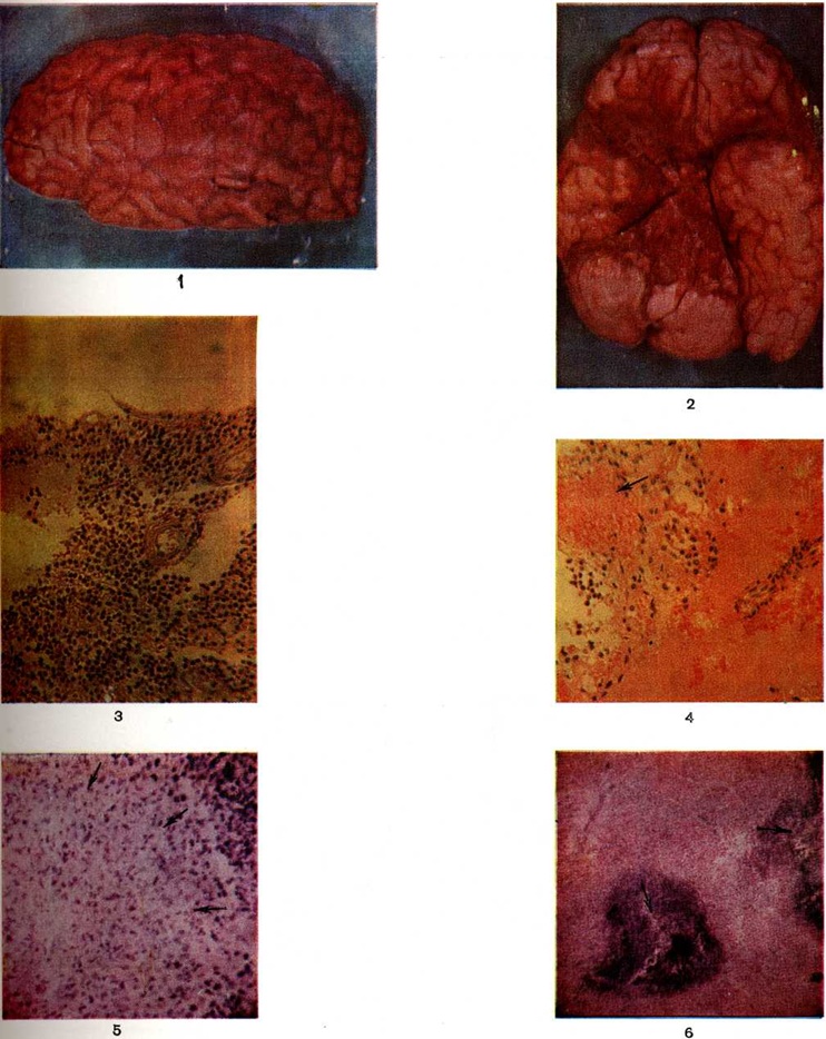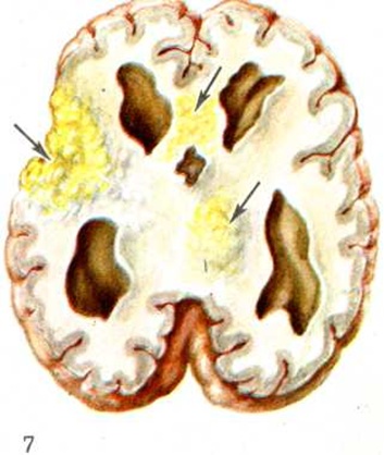 При гнойном Менингит воспалительный выпот имеет сначала серозный характер, а на 2—3-й день заболевания он приобретает вид гнойного экссудата. При этом мягкие оболочки полушарий мозга (цветной рисунок 1), сосудистые сплетения и эпендима пропитаны мутной желтовато-зеленоватой вязкой ЖИДКОСТЬЮ. При обильном накоплении гнойнофибринозный экссудат образует «чепчик» в лобной и теменной долях полушарий (цветной таблица, ст. 33, рисунок 2) или окутывает весь мозг сплошной массой. Он заполняет также мозговые полости, покрывая желтоватой плёнкой сплетения и стенки желудочков. Развивающаяся обтурация ликворных путей выпотом ведёт к острому расширению желудочков мозга (цветной рисунок 3) и церебральной гипертензии. В воспалительный процесс могут вовлекаться подоболочечные отделы мозгового вещества, но особенно часто области, окружающие желудочки. При своевременно начатом лечении гнойный экссудат подвергается ферментативному распаду и резорбции, но в некоторых случаях он организуется, вызывая спаечный процесс в оболочках и желудочках мозга. Развивается хронический гнойный или хронический продуктивный (адгезивный) лептоменингит, характеризующийся частичной облитерацией подпаутинного пространства с образованием между листками мягкой оболочки замкнутых гнойных или серозных полостей. Спайки могут рассекать также и желудочки мозга, формируя отдельные заполненные гноем или цереброспинальной жидкостью камеры. Макроскопическую картину хронический продуктивного Менингит дополняет склероз оболочек, сплетений и эпендимы с полной или частичной облитерацией находящихся здесь сосудов. Резко нарушаются циркуляция цереброспинальной жидкости и мозговая гемодинамика, что ведёт к развитию гидроцефалии. Гистологически в оболочках, эпендиме и сплетениях обнаруживается картина хронический гнойного воспаления с выраженными склеротическими изменениями. В соседних участках мозговой ткани можно наблюдать поля клеточного опустошения с дистрофией и гибелью нейронов и накоплением в них липофусцина, демиелинизацию нервных волокон и очаговый глиоз. Описанные изменения могут выявляться и без предшествующей клиники острого Менингит, через несколько лет после травмы, инфекционного заболевания или оперативного вмешательства. Если в оболочечном выпоте содержатся эритроциты и, следовательно, мягкие мозговые оболочки окрашиваются в различные оттенки красного цвета, то такое воспаление этих оболочек носит название геморрагического (цветной рисунок 2). Геморрагический лептоменингит (цветной рисунок 4) может осложнить инфекционные заболевание, сопровождающееся общим тромбогеморрагическим синдромом или местной гиперергической реакцией немедленного типа. Сходную макроскопическую картину из-за примеси крови имеет реактивное воспаление в зоне субарахноидального кровоизлияния. Дифференциальной диагностике в этих случаях может помочь гистологический исследование материала — при инфекционном геморрагическом Менингит обнаруживают фибриноидные некрозы сосудов (смотри полный свод знаний Фибриноидное превращение), их тромбоз и преимущественно гранулоцитарную инфильтрацию очага воспаления. Туберкулёзный лептоменингит — результат гематогенной генерализации или лимфогенного распространения инфекции из лёгочного, лимфожелезист