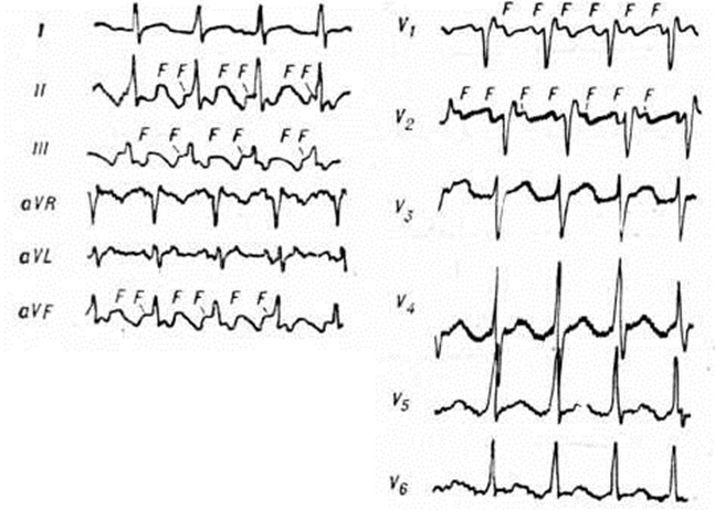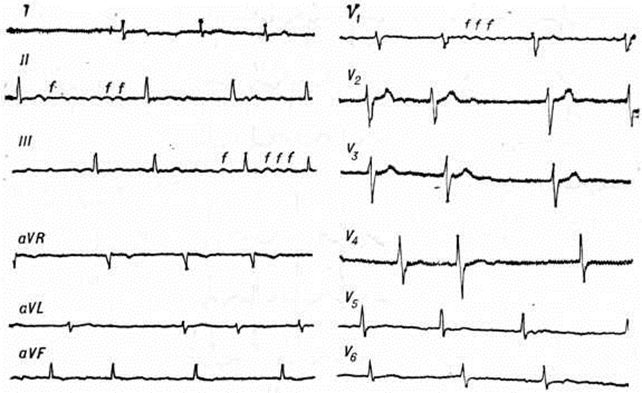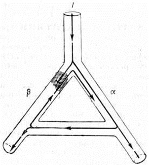 В более редких случаях причинами её возникновения служат нарушения гемодинамики и изменения миокарда при миокардитах, кардиомиопатиях. В очень редких случаях Мерцательная аритмия является следствием травм сердца, в том числе операционной, раздражения предсердий зондом или их электрической стимуляции, электротравмы. Известны случаи возникновения Мерцательная аритмия при токсикоинфекциях (пневмония, тифы и другие), а также интоксикациях (окисью углерода, симпатомиметическими аминами, сердечными гликозидами и другие). По данным разных авторов, острый инфаркт миокарда осложняется Мерцательная аритмия в 5—17% случаев. Ещё реже это нарушение ритма наблюдается при эмболии лёгочной артерии, а также у больных с лёгочным сердцем. Описаны случаи семейной Мерцательная аритмия в сочетании с отосклерозом или без него. Нередко Мерцательная аритмия сочетается с синдромом Вольффа — Паркинсона— Уайта (смотри полный свод знаний Вольффа — Паркинсона — Уайта синдром). Пароксизмы Мерцательная аритмия иногда возникают при значительном психоэмоциональном напряжении или вскоре после него. В связи с этим многие учёные предполагают, что Мерцательная аритмия может иметь чисто психогенное происхождение. Однако более вероятно, что в подобных случаях психоэмоциональные факторы играют лишь роль пускового механизма аритмии у людей с органическими изменениями предсердий или с наличием предпосылок к их ишемии (своеобразная форма ишемической болезни сердца). Патогенез. Для объяснения патогенеза Мерцательная аритмия было предложено несколько теорий, из которых две считаются основными: теория множественных очагов автоматизма и теория циркулярной волны возбуждения. Сущность первой теории, созданной Шерфом (D. Scherf), сводится к тому, что при определённых условиях, например, при длительном перенапряжении предсердий или появлении в их стенках очагов дистрофии или кардиосклероза, в миокарде предсердий образуется множество несогласованно функционирующих очагов автоматизма. Исходящие из этих очагов импульсы частично интерферируют, частично непосредственно возбуждают прилежащий миокард, в результате чего сокращение волокон миокарда предсердий становится совершенно беспорядочным. Согласно второй теории, предложенной Льюисом (Th. Lewis, 1914), при описанных выше условиях создаются предпосылки для кругового движения волны возбуждения по миокарду предсердий вокруг отверстий полых вен. От этой основной волны центробежно отделяются вторичные волны, которые, интерферируя друг с другом, вызывают беспорядочные сокращения мышечных волокон миокарда предсердий. Идея циркуляции волны возбуждения получила развитие в теории повторного входа возбуждения в миокард (re-entry), получившей наибольшее признание. Эта теория состоит в том, что в миокарде возникают предпосылки для циркуляции возбуждения и повторного входа его волны в те участки, из которых оно пришло в патологически изменённую область (рисунок 1).Нередко такая ситуация возникает в результате предсердной экстрасистолы, возбуждающей миокард в тот момент, когда не все его волокна вышли из состояния рефрактерности (так называемый фаза ранимости предсердий, на ЭКГ соответствующая примерно нисходящему отрезку зубца R или начальному отделу сегмента S—Т). В пользу теории повторного входа возбуждения в 
