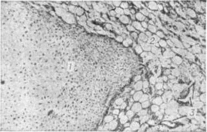 Макроскопически Мезенхимома, как правило, достигает больших размеров, имеет чаще серо-жёлтый цвет, плотноэластическую консистенцию. Микроскопически тканевые компоненты Мезенхимома могут соответствовать зрелым опухолям типа липомы (смотри полный свод знаний), миомы (смотри полный свод знаний), капиллярной ангиомы (смотри полный свод знаний) и другие, иногда могут быть близкими к миосаркоме (смотри полный свод знаний), липосаркоме (смотри полный свод знаний) и некоторым другим опухолям. Наряду с различными сочетаниями жирового, мышечного, хрящевого, костного и других компонентов ткани (рисунок) в Мезенхимома встречаются низкодифференцированные участки эмбрионального вида, построенные из полиморфных клеток овальной, веретенообразной и звездчатой формы, иногда с признаками липобластической дифференцировки, расположенных в миксоматозном основном веществе с небольшим количеством волокон и сосудов капиллярного типа.