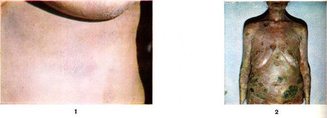 В пролифератах обнаруживают так называемый микозные клетки — атипичные лимфоидные клетки со свойствами Т-лимфоцитов с крупным мозговидным и почкообразным ядром. Висцеральная патология обнаруживается у больных Микоз грибовидный в 15—20% случаев, при этом микроскопические изменения в органах менее выражены, чем в коже, и характеризуются гиперплазией клеток лимфоидной и ретикулярной ткани с признаками атипизма. В патологический процесс вовлекаются лимфатических, узлы, лёгкие, печень, селезёнка, желудок, реже сердце, почки, надпочечники, поджелудочная железа, мозговые оболочки, крайне редко костная система. Клиническая картина. Различают классическую (Алибера — Базена), «обезглавленную» (Видаля — Брока) и эритродермическую (Аллопо — Бенье) формы Микоз грибовидный В классической форме выделяют следующие стадии: I — экзематоидно-эритродермическую, II — бляшечно-инфильтративную, III — опухолевую. I стадия характеризуется полиморфизмом начальных поражений кожи, напоминающих экзему, нейродермит, псориаз, красный плоский лишай, герпетиформный дерматит и локализующихся преимущественно на боковых поверхностях туловища, на животе, спине и конечностях. В 20—30% случаев в процесс постепенно вовлекается весь кожный покров (вторичная эритродермия). Общее состояние больных обычно удовлетворительное. II стадия характеризуется появлением резко ограниченных, несколько возвышающихся над окружающей кожей плоских инфильтративных бляшек с грубой шагреневой поверхностью, в диаметре от 2 до 20 сантиметров и более (цветной рисунок 1). Бляшки отличаются насыщенным темно-красным или синюшным цветом с буроватым оттенком, плотноэластической (иногда плотной) консистенцией и возникают как в существующих очагах поражения, так и на неизменённой коже. Нередко в их центральной части появляется западание, в результате чего образуются кольцевидные фигуры, которые, разрастаясь и сливаясь, формируют дуги, гирлянды. Местами на бляшках видны тонкие отрубевидные чешуйки. Некоторые дерматологи пользуются термином «премикоз» для обозначения I и II, то есть предопухолевых, стадий Микоз грибовидный В III стадии на месте бывших бляшек появляются опухолевидные, нередко грибовидной формы образования, склонные к изъязвлению (цветной рисунок 2). Они насыщенно-красного с синюшно-багровым оттенком цвета, различной величины (в диаметре от 1 до 5 сантиметров и больше), плотны на ощупь, возвышаются на 1—4 сантиметров над уровнем окружающей кожи, тесно с ней спаяны; их поверхность гладкая или бугристая, слегка шелушащаяся. Для них характерен быстрый, в течение нескольких недель, рост и распад с образованием глубоких язв с валикообразно утолщёнными краями, кровянисто-гнойным отделяемым и остатками гангренозно-распавшихся тканей. Во II и чаще в III стадии у больных нередко наблюдаются слабость, недомогание, потеря аппетита, субфебрильная температура, поражение внутренних органов (сердца, почек, лёгких), сепсис и другие тяжёлые осложнения, от которых больные могут погибнуть. «Обезглавленная» форма отличается развитием опухолевидных образований на коже без предшествующих экзематондио-эритродермической и бляшечно-инфильтративной стадий. Эритродермическая форма развивается у большинства больных без предшествующих высыпаний, в виде эритродермии по всему кожному покрову, 