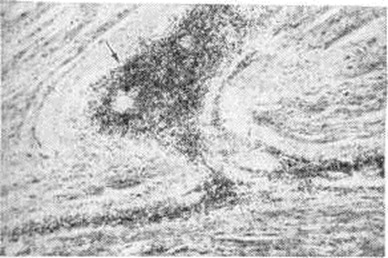 Изучение материала, полученного с помощью эндомиокардиальных биопсий у детей с клинические, диагнозом миокардиопатии, показало, что в большинстве случаев гисто л. картина соответствует этой форме Миокардит Морфологически — это неспецифический интерстициальный Миокардит с лимфогистиоцитарным инфильтратом, параллельно протекающими процессами его резорбции и фиброзного превращения, нерезко выраженным дистрофическим компонентом. Скудность клеточной инфильтрации в большинстве исследованных биоптатов свидетельствует о затухающем или медленно прогрессирующем Миокардит, и идентификация его требует особо тщательного гистологический анализа. В случаях, когда клеточная инфильтрация практически не определяется, перенесённое воспаление подтверждается только наличием полей кардиосклероза. Длительность процесса оценивается по степени развития кардиосклероза. Фоном воспалительной инфильтрации и кардиосклероза служит гипертрофия миокарда, которая отличается некоторой мозаичностью, неравномерностью в распределении гипертрофированных пучков мышечных волокон. Приведённые материалы оправдывают допущение, что Миокардит взрослых в части случаев, возможно, связан с Миокардит детского возраста. Трансплантационный миокардит в морфологическом отношении является также неспецифическим — это реакция отторжения пересаженного сердца. Отнесение этой реакции к миокардитам продиктовано не только морфодинамикой процесса, повторяющей морфодинамику диффузного интерстициального Миокардит в его существенных чертах, но и адекватным отображением в данных электрокардиографии. В гистологический картине доминирует инфильтрация миокарда клетками лимфоидного типа и гистиоцитами. Характерная особенность этого Миокардит— выраженный плазмоцитогенез в клетках инфильтрата с нарастанием числа зрелых плазматических клеток. Гранулематозный (специфический) миокардит характеризуется наличием гранулемы (смотри полный свод знаний) в миокарде (рисунок 8). Он различен по происхождению, но чаще имеет инфекционную этиологию. Наиболее известны туберкулёзный, сифилитический, ревматический и грибковый гранулематозные Миокардит, а также Миокардит при саркоидозе. Гранулематозные элементы туберкулёзного Миокардит могут быть в форме милиарных узелков или солитарных туберкулом с центральным казеозом. При гистологический дифференциальной диагностике следует иметь в виду сходство туберкулёзных гранулем с гранулемами при Миокардит другой этиологии — при криптококкозе, кокцидиоидозе, гистоплазмозе. Многие грибковые Миокардит могут развиваться при лучевой терапии по поводу лейкозов и злокачественных опухолей. Грибковый Миокардит чаще развивается на фоне иммунологической подавленности, а также при грибковом эндокардите у больных с протезами клапанов сердца. Морфологически грибковый Миокардит характеризуется милиарными гранулемами, в центре которых обнаруживают нити грибка. Сифилитическое поражение миокарда в форме диффузного Миокардит и гумм встречается чрезвычайно редко. К гранулематозному Миокардит можно отнести и поражения миокарда в некоторых случаях подострого септического эндокардита с развитием в миокарде так называемый узелков Брахта — Вехтера — мелких гнёзд ишемического некроза миокарда в различной стадии орг