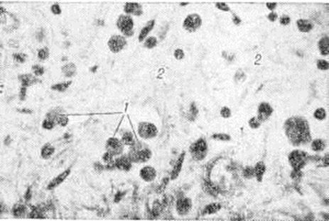 Неспецифический миокардит — наиболее частая форма, обычно характеризующаяся смешанным типом морфологический изменений, при котором одновременно выявляются различные варианты гисто л. картины воспаления. Морфологически проявления варьируют в зависимости от особенностей и соотношения каждого из основных компонентов воспаления — дистрофического, пролиферативного (воспалительно-инфильтративного) и экссудативного, а также от стадии и длительности течения Миокардит Дистрофический компонент воспаления, под которым имеется в виду морфологический отражение нарушений обмена в миокарде (а не сами эти нарушения, то есть миокардиодистрофия в понимании Г. Ф. Ланга), объединяет все формы дистрофических, некробиотических и некротических процессов, которые развиваются в миокарде при различных обстоятельствах, не имеющие какой-либо специфики при включении их в воспалительный комплекс: белковую (паренхиматозную), липидную, водяночно-вакуольную дистрофию (смотри полный свод знаний Дистрофия клеток и тканей). Гистохимические и электронно-микроскопические исследования не выявляют каких-либо особенностей дистрофического компонента воспаления, отличных от известных форм и стадий дистрофии миокарда различного происхождения. Распространённый очаговый кардиомиоцитолиз приводит к опустошению более или менее обширных участков миокарда (рисунок 3), их депаренхиматизации, при которой в этих участках от сократительного миокарда остаётся только аргентофильная строма с сохранившимися в ней остатками кардиомиоцитов и мелкими глыбками бурого пигмента. Эти процессы могут сопровождаться лишь незначительной клеточной реакцией в строме миокарда. В дальнейшем происходит сближение мышечных волокон по периферии депаренхиматизированных гнёзд с последующим замещением их грануляционной и зрелой рубцовой тканью, то есть наблюдается исход в кардиосклероз. Выраженный некробиоз, переходящий в некроз, характеризуется мелко и крупно-глыбчатым распадом цитоплазмы кардиомиоцитов; при этом возможно длительное сохранение сарколеммы и ядер. Интенсивность дистрофических процессов варьирует в широких пределах в зависимости от интенсивности патогенного воздействия, его преимущественной паренхимотропности. Некробиотические процессы приводят к развитию обширных участков некроза миокарда с превращением этих участков в мелкозернистый эозинофильный детрит, окаймлённый зоной лимфогистиоцитарного инфильтрата. Подобные морфологические изменения могут напоминать феномен Артюса (смотри полный свод знаний Артюса феномен) . По характеру воспалительной инфильтрации (пролиферативный компонент воспаления) при интерстициальном (межуточном) Миокардит различают очаговый и диффузный варианты. При первом варианте клетки воспалительного инфильтрата располагаются в виде более или менее крупных, но ограниченных гнёзд (рисунок 4). При втором варианте клетки воспалительного инфильтрата диффузно пронизывают межуточную ткань миокарда, раздвигая сердечные мышечные волокна (рисунок 5), располагаясь вдоль них и охватывая различные по протяжённости участки миокарда. При диффузном Миокардит не обязательно тотальное поражение, охват воспалением всей массы миокарда, что бывает при острейшем, бурно развивающемся Миокардит Большей частью воспаление, даже 