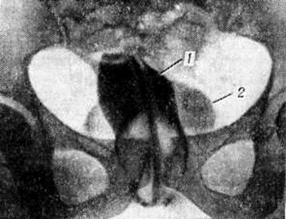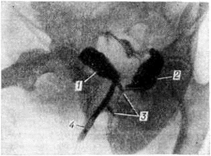 Сложные и комбинированные свищи. Весьма тяжёлое клиническое течение характерно для сложных и комбинированных свищей, при которых одновременно существует патологический сообщение между мочевым пузырём, влагалищем и прямой кишкой (рисунок 3) или имеет место значительное разрушение дна, мочепузырного треугольника и боковых стенок мочевого пузыря с полным или частичным дефектом задней стенки уретры, что приводит иногда к искусственной влагалищной экстрофии (выпадению) мочевого пузыря. У таких больных моча содержит примесь газа и кала, развиваются воспалительные осложнения со стороны мочевого пузыря и почек. Постоянное подтекание мочи из влагалища ведёт к мацерации промежности и бёдер с развитием гнойничковых заболеваний кожи. Больные избегают общества, у них часто наблюдается тяжёлое депрессивное состояние. Консервативное лечение сложных Мочеполовые свищи, как правило, не приводит к выздоровлению и может только уменьшить воспалительные осложнения. Оперативное лечение часто многоэтапное с использованием в качестве пластического материала сальника, стенки мочевого пузыря, матки и кожи; оно даёт высокий процент рецидивов. Повторные вмешательства приводят к формированию массивных рубцов, значительному уменьшению ёмкости мочевого пузыря, к деформации кишки и влагалища; утрачивается способность тканей к регенерации, что делает невозможным ликвидацию свища и восстановление физиологический функций. В подобных ситуациях производят операцию кольпоклейзиса (сшивание стенок влагалища ниже свища) или эпизиоклейзиса (зашивание входа во влагалище), что позволяет создать мочевой резервуар с трансректальным мочеиспусканием. При сложных неоперабельных свищах со значительной дилатацией мочеточников осуществляют отведение мочи посредством уретерокутанеостомии (смотри полный свод знаний Уретеропластика) или двусторонней нефростомии (СМ.). Смотри полный свод знаний Свищи.