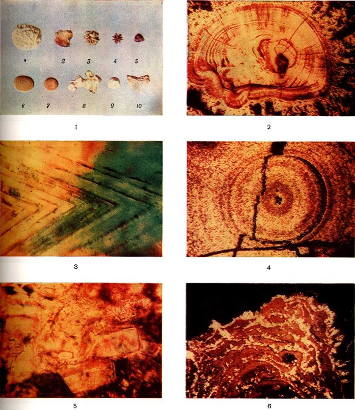 Величина, форма и консистенция Мочевые камни разнообразны. Мелкие Мочевые камни имеют вид песчинок, большое количество которых образует так называемый мочевой песок. Более крупные Мочевые камни обычно имеют округлую, овальную или реже коралловидную форму, повторяя наподобие слепка конфигурацию вместилища, в котором они образуются (цветной рисунок 1). Общим в структуре Мочевые камни является наличие так называемый ядра, вокруг которого расположена различной толщины оболочка, или тело, камня (смотри полный свод знаний Конкременты).