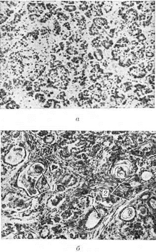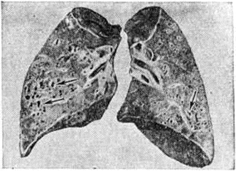 Застой вязкой мокроты в бронхах приводит к обтурационным ателектазам, компенсаторной эмфиземе и вторичному инфицированию. Развивается хронический бронхит (смотри полный свод знаний), гнойные бронхоэктазы, хронический пневмония с абсцедированием (рисунок 2). Клиническая картина. Признаки заболевания могут отмечаться уже в период новорожденности, наиболее выраженная картина болезни в этот период — мекониальный илеус (смотри полный свод знаний Непроходимость кишечника, у детей), осложнением которого является перфорация кишечника и мекониальный перитонит. По данным Муковисцидоз А. Фадеевой (1977), у 80,3% детей с Муковисцидоз начальные признаки заболевания появляются на первом году жизни. При наличии хорошего, даже повышенного, аппетита дети не прибавляют в весе, могут отставать в росте; тонус мышц и тканей снижен. Отмечается сухость во рту, слюна вязкая; живот вздут, увеличен в объёме, характерен обильный стул, кал резко зловонный, блестящий, светлый, часто серого цвета с большим количеством жира — стеаторея (смотри полный свод знаний); на пелёнках плохо отстирываемые жирные пятна. Могут быть и запоры, но кал и в этих случаях жирный и зловонный. В ряде случаев при наличии запоров у детей, больных Муковисцидоз, наблюдается гепатомегалия, выпадение прямой кишки. Нарушаются обменные процессы — отмечаются гипопротеинемии, гиповитаминоз. Нередко заболевание сопровождается нарушением процесса всасывания в кишечнике и пиелонефритом. При рентгенологическое исследовании кишечника обнаруживают картину псевдоасцита (расширенные петли кишечника с горизонтальными уровнями содержимого). Изменения со стороны лёгких проявляются в виде приступообразного кашля, иногда коклюше-подобного характера. Отмечается постоянная одышка и цианоз. Грудная клетка бочкообразная, ногтевые фаланги имеют форму барабанных палочек. Хронический гипертензия малого круга кровообращения, обусловленная хронический воспалительным процессом в лёгких, ведёт к формированию лёгочного сердца (смотри полный свод знаний) и сердечной недостаточности (смотри полный свод знаний) Часто возникают ателектазы (смотри полный свод знаний) с развитием хронический пневмонии (смотри полный свод знаний) и бронхоэктазов (смотри полный свод знаний). Сгущение секрета в слизистых железах полости носа и придаточных (околоносовых, часть) пазухах обусловливает развитие хронического ринита, синусита с полипозом Рентгенологически лёгочные поражения при Муковисцидоз характеризуются распространённостью и большой пестротой, обусловленной сочетанием перибронхиальных инфильтративных и склеротических изменений на фоне выраженной эмфиземы. Исходя из указанных симптомов заболевания, времени их проявления и преимущественного поражения тех или иных систем выделяют ряд клинические, форм Муковисцидоз: мекониальный илеус новорожденных; лёгочная форма; кишечная форма; смешанная форма с одновременным поражением желудочно-кишечные тракта и бронхолёгочной системы. Отмечаются также стёртые формы. Диагноз основывается на клинических данных, а также результатах биохимический обследования. Ранняя диагностика Муковисцидоз возможна при массовом обследовании новорожденных путём применения скрининг-тестов. Одним из таких тестов является определение повышенного количества альбумина