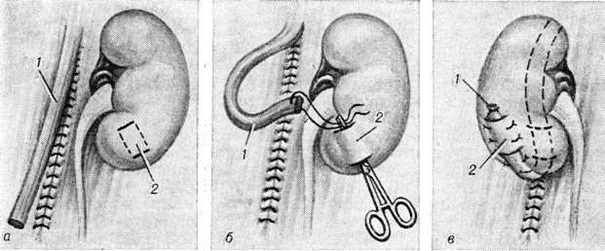 Возможна фиксация почки с помощью гамаков, суспензориев, тесёмок, лямок и так далее, изготовленных из синтетических материалов. Остальные методы оперативного лечения имеют лишь историческую ценность. Наиболее эффективным является метод Ривуара, особенно в модификации Пытеля—Лопаткина (1967) или модификации Мельника (1969), позволяющий сократить количество рецидивов заболевания. При нефропексии по Пытелю—Лопаткину после люмботомии (смотри полный свод знаний) и обнажения почки выкраивают продольный лоскут поясничной мышцы на ножке, проводят его в туннели под фиброзной капсулой от уровня ворот по задней поверхности почки, вокруг её нижнего полюса на переднюю поверхность. Лоскут фиксируют швами к почечной капсуле (рисунок, а, б, в). При рубцовом изменении фиброзной капсулы, а также при сочетании Нефроптоз с ротацией почки показана нефропексия в модификации Мельника, при которой лоскут из поясничной мышцы раздваивается и обе части его пришивают супракапсулярно в продольном и поперечном направлениях.