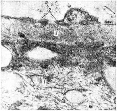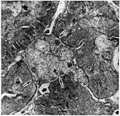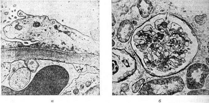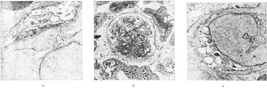 Морфологически эквивалентом протеинурии и истощения резорбтивной функции эпителия канальцев является гиалиново-капельная, вакуольная, баллонная и жировая дистрофия эпителия (цветной рисунок 1, 2, 3), при которых активность .ферментов в эпителии нефронов резко снижена (смотри полный свод знаний Дистрофия клеток и тканей). Электронно-микроскопически обнаруживаются набухание, вакуолизация и распад митохондрий, разрыв цистерн цитоплазматической сети, разрушение мембран. В результате дистрофических процессов развивается некробиоз и десквамация эпителия, которые являются основой формирования цилиндров, обтурирующих просветы канальцев, что приводит к кистозному их расширению и атрофии. Отражением функциональный недостаточности лимфатических, системы почек — второй системы реабсорбции при Нефротический синдром служит отёк интерстиция, который быстро сменяется склерозом, причём среди разрастаний соединительной ткани часто встречаются большие светлые клетки с пенистой цитоплазмой (рисунок 2), которые считают макрофагами, фагоцитировавшими липиды. В сосудах почек находят плазматическое пропитывание и гиалиноз, склероз стенок. Первичный нефротический синдром. Морфология первичного Нефротический синдром складывается из изменений, характерных для следующих его форм: липоидный нефроз, фокальный сегментарный гломерулярный гиалиноз, мембранозный гломерулонефрит (мембранозная нефропатия), врождённый Нефротический синдром (сведения о нем см. ниже). Липоидный нефроз (синонимы: идиопатический Нефротический синдром детей, нефропатия с минимальными изменениями) описан впервые Мунком (F. Munk, 1913), который обнаружил в моче больных и в эпителии канальцев липиды. Он полагал, что изменения в почках связаны с общими нарушениями обмена. Долгое время термины «липоидный нефроз», «мембранозный гломерулонефрит», «второй тип нефрита Эллиса», «нефротический синдром» употреблялись как синонимы. Благодаря работам Джонса (D. В. Jones, 1957) было выделено несколько форм Нефротический синдром: минимальные гломерулярные изменения, мембранозный гломерулонефрит и лобулярный гломерулонефрит. Название «липоидный нефроз» было оставлено только для обозначения своеобразной патологии детей, проявляющейся Нефротический синдром с минимальными изменениями в клубочках почек, выявляемых при светооптическом исследовании. Термины «липоидный нефроз» и «минимальные изменения» стали использоваться как синонимы. Сущность минимальных изменений установлена с помощью электронной микроскопии материала биопсии почек. При липоидном нефрозе изменяются только подоциты, у которых происходит слияние малых отростков, базальная мембрана при этом остаётся неизменённой (рисунок 3, а). После нескольких лет болезни к минимальным изменениям присоединяется очаговое утолщение базальных мембран капилляров (рисунок 3, б), увеличение мезангиального матрикса или количества мезангиальных клеток. Если заболевание ведёт к почечной недостаточности, в клубочках обнаруживают фокальный сегментарный склероз капилляров. В эпителии проксимальных канальцев на ранних стадиях болезни выявляют двоякопреломляющие липиды и гранулы резорбированного белка. Со временем липиды исчезают из эпителия, появляются признаки атрофии канальцев, которая никогда не бывает значительной. Инте