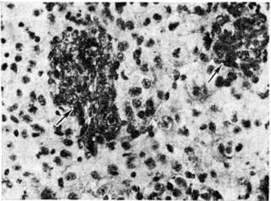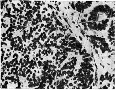 Нейробластома встречаются редко, преимущественно в детском и юношеском возрасте. По локализации различают Нейробластома головного мозга и Нейробластома, исходящие из элементов симпатической части высшая нервная система Патологическая анатомия. Из Нейробластома головного мозга описаны Нейробластома области серого бугра и третьего желудочка, белого вещества полушарий большого мозга, мозжечка. Макроскопически опухоль имеет вид узла серо-розового цвета диаметром от 1 до 1,5 сантиметров на разрезе ткань опухоли пористая, нередко с кистами. Микроскопически Нейробластома состоит из довольно плотно примыкающих друг к другу клеток, местами с образованием розеток, состоящих из безотростчатых аполярных нейробластов, выявляемых при импрегнации по Бильшовскому — Грос — Лаврентьеву. Опухолевые клетки представлены нейробластами различной степени зрелости, вплоть до зрелых ганглиозных клеток с нисслевской зернистостью в цитоплазме. Ядра опухолевых клеток пузырьковидные, различны по величине, с чётким темно-окрашенным ядрышком (рисунок 1). Соединительнотканная строма развита слабо. В ткани опухоли встречаются митозы, некрозы. Рост Нейробластома инфильтративный с неглубоким прорастанием окружающей ткани.