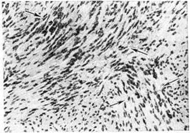 Гистологически клетки опухоли образуют фасцикулярные структуры, располагающиеся параллельными рядами (рисунок 1) или в виде завитков. Встречаются особые палисады из палочковидных ядер (рисунок 2), между которыми расположена нежная волокнистость. Последняя образована цитоплазмой этих клеток и тонкими аргирофильными фибриллами, выявляемыми по способу Фута (смотри полный свод знаний Серебрения методы). Раньше предполагали, что эти фибриллы нервного или глиального происхождения. В современной литературе считается, что они скорее всего представляют собой ретикулярные волокна. По методу Ван-Гизона (смотри полный свод знаний Ван-Гизона метод) фибриллы окрашиваются в желтоватый или розоватый цвет. В длительно растущих и рецидивирующих Невринома количество коллагеновых волокон возрастает. Они могут подвергаться гиалинозу (смотри полный свод знаний).