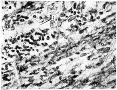 Развитие в периферических нервах воспалительного процесса отмечается иногда при сифилисе, лепре, бруцеллёзе. Наблюдаемое в некоторых случаях избирательное поражение вегетативных, двигательных или чувствительных волокон нерва объясняется тем, что эти волокна в онто и филогенезе приобрели известные отличия в строении и течении обменных процессов. Патологическая анатомия. Морф, критерии воспаления часто не совпадают с клинические, представлениями о Невриты как о воспалительном процессе в нерве. Отдельные формы Невриты протекают без признаков воспаления и обозначаются как невропатии (смотри полный свод знаний Невропатия в неврологии) и полиневропатии. Морфологически различают паренхиматозные (дегенеративные) и интерстициальные Невриты При паренхиматозных Невриты наблюдается дегенерация нервных волокон, миелиновых оболочек и леммоцитов. Различают два типа дегенерации нервных волокон — аксональный и сегментарный (смотри полный свод знаний Нервные волокна). При большинстве невропатий и невритов отмечается смешанный тип дегенерации, но при некоторых болезнях (например, при сахарном диабете) преобладает сегментарная демиелинизация (рисунок 1), а при порфирии — аксональная невропатия (рисунок 2). При интерстициальных Невриты воспалительный процесс локализуется в соединительной ткани нерва. В эндо и периневрии обнаруживается васкулит (смотри полный свод знаний). Отмечается набухание эндотелия сосудов нерва, в интра и периваскулярных пространствах — отёк, инфильтрация лимфоидными клетками и сегментоядерными лимфоцитами, которые могут скапливаться в эндо и периневрии (рисунок 3). Воспалительный процесс в эндоневрии сопровождается пропотеванием мукоидной субстанции и вторичным местным вспучиванием нервных волокон с последующей валлеровской дегенерацией (смотри полный свод знаний Валлера перерождение) и сегментарной демиелинизацией. Интерстициальные Невриты могут отмечаться при таких заболеваниях, как лепрозный Невриты, семейный амилоидоз, метахроматическая лейкодистрофия, синдром Гийена — Барре — Штроля (смотри полный свод знаний Полиневрит), узелковый периартериит. При инфекционных Невриты отмечается сочетание патологический изменений, характерных для паренхиматозного и интерстициального Невриты Такие Невриты встречаются при дифтерии, бруцеллёзе, ботулизме, инфекционном гепатите, ветрянке, кори, стрептококковой инфекции, мононуклеозе, лептоспирозах, малярии. Туберкулёзные Невриты протекают по типу паренхиматозных. Они возникают по соседству с поражёнными туберкулёзным процессом лимфатических, узлами, холодными абсцессами. Межрёберные нервы, плечевое сплетение поражаются при туберкулёзных плевритах. Изредка в периферических нервах и корешках обнаруживают туберкулёзные гранулемы. Невриты при сифилисе встречаются редко. При этом нервные волокна поражаются, как правило, вторично, например, в связи с сифилитическим гиперостозом. В редких случаях, например, при так называемый склерогуммальном Невриты локтевого нерва в периферических нервах обнаруживают гуммы. При диабетических Невриты отмечаются ранние патологический изменения в виде сегментарной демиелинизации, при тяжёлых формах — в виде аксональной дегенерации. В мелких сосудах эндоневрия появляется гиперплазия внутренней и средней 