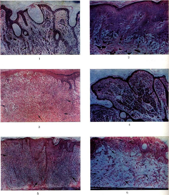 Макроскопически выглядит обычно как плоский или шаровидный чётко отграниченный одиночный узел бледно-красного, желтовато-серого, реже коричневого или чёрного цвета с гладкой, иногда папилломатозной или бородавчатой поверхностью. Роста волос на поверхности этого Невус не отмечается. В окружающей коже могут быть телеангиэктазии (смотри полный свод знаний). При микроскопическом исследовании в поверхностных слоях дермы обнаруживаются невусные клетки со светлой или слегка базофильной цитоплазмой и гиперхромными ядрами; встречаются эпителиоподобные клетки со светлой пенистой цитоплазмой, а также одно и многоядерные гигантские клетки типа клеток Тутона (цветной рисунок 3). Невус из баллонообразных клеток (баллоноклеточный, светлоклеточный) образован крупными полигональной формы светлыми клетками с пенистой цитоплазмой, мелкими, часто гиперхромными ядрами (цветной рисунок 6), Невусные клетки располагаются в дерме в виде пласта, разделённого тонкими прослойками стромы. Галоневус (болезнь Саттона) описан впервые в 1916 год Саттоном (R. L. Sutton). Является сочетанием внутридермального Невус и витилиго (смотри полный свод знаний). Чаще бывает множественным, располагается главным образом на коже туловища, верхних конечностей, реже на коже лица. Макроскопически имеет вид красно-коричневого узелка округлой или овальной формы диаметром в среднем 4—5 миллиметров, слегка возвышающегося над поверхностью кожи и окружённого кольцом депигментированной кожи. Светлый ободок депигментированной кожи обычно в 2—3 раза шире пигментированного узелка. Микроскопически в эпидермальной зоне обнаруживают скопление полигональных невусных клеток с пузырьковидными ядрами; в ряде случаев встречаются веретенообразные невусные клетки (цветной рисунок 5). В эпидермисе отмечается гиперкератоз и акантоз. Гигантский пигментный невус — врождённое пигментное пятно больших размеров, занимающее значительную часть кожи туловища, шеи и конечностей, нередко в виде воротника, купальника или жилетки. Цвет пятна, как правило, не однороден — от грязно-серого до коричневого и чёрного на разных участках. Гистологический строение напоминает внутридермальный Невус Фиброзная папула носа (инволютивный невус) макроскопически имеет вид красноватого и коричневатого куполообразного возвышения на коже носа. Микроскопически состоит из фиброзной ткани, в которой располагаются многоядерные гигантские клетки; по периферии определяются гнезда мелких невусных клеток. Голубой невус впервые описан в 1906 год Тьешем (М. Tieche). Чаще встречается у женщин среднего возраста, располагается главным образом на коже лица, предплечий и кистей рук. Имеет вид округлого или овального хорошо отграниченного эластичного пятна или узелка диаметром от 4 миллиметров до 2 сантиметров, темно-синего или голубовато-серого цвета, обычно не возвышающегося над уровнем окружающей кожи. Поверхность его гладкая, лишена волос. Микроскопически характеризуется наличием в глубоких отделах дермы многочисленных мелких очагов, состоящих из клеток веретенообразной формы с удлинёнными ядрами и скудной цитоплазмой (цветной рисунок 7). Из глубоких отделов дермы невусные клетки могут проникать в подкожную клетчатку.