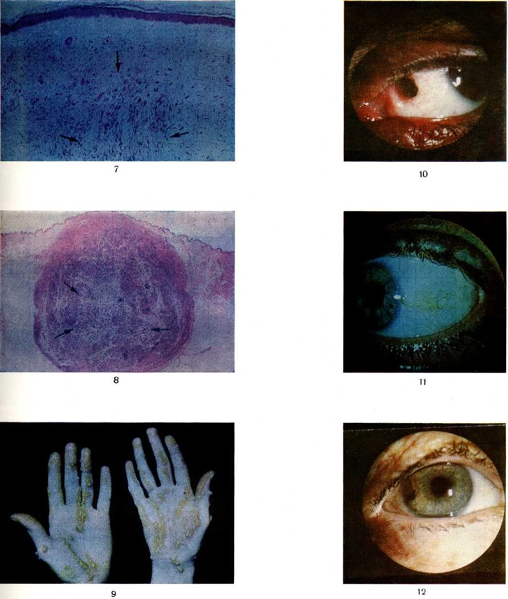 Клеточный голубой невус (пролиферирующий невус) отличается от голубого Невус разнообразием клеточного состава, наличием большого числа клеток и отсутствием склонности к фиброзированию. По мнению некоторых исследователей, клеточный голубой Невус чаще располагается в поясничной и крестцовой областях, реже на коже лица; по мнению других, он чаще наблюдается на коже стоп. При гистологический исследовании в дерме видны пучки из вытянутых и овальной формы невусных клеток (цветной рисунок 8), в глубоких отделах часто обнаруживают обильные включения меланина. Другие формы невуса кожи и слизистых оболочек. Некоторые виды Невус не отличаются по морфологический строению, но имеют ряд клинические, особенностей. К таким Невус относят монгольское пятно, невус Оты п линейный эпидермальный Невус Монгольское пятно является особой разновидностью голубого Невус Возникает чаще у представителей азиатских народов через 1—2 дня после рождения в виде синеватых, голубоватых или коричневых плоских пятен диаметром до 6 — 10 сантиметров на коже поясничной и крестцовой областей. В 4—5-летнем возрасте монгольское пятно постепенно уменьшается в размерах и исчезает. Невус Оты (черно-синюшный глазоверхнечелюстной Невус) описан в 1939 год Отой (M. H. Ota). Является разновидностью голубого Невус Наблюдается в основном у представителей азиатских народов, чаще у женщин. В 60% случаев бывает врождённым, в других случаях обнаруживается в первом десятилетии жизни. С возрастом может несколько бледнеть, но не исчезает в течение всей жизни. Макроскопически имеет вид пигментного пятна в зоне иннервации I и II ветвей тройничного нерва с темно-коричневой пигментацией кожи, иногда распространяющейся на кожу в области лба и крыла носа, конъюнктиву, склеры и радужку. При этом пигментация может иметь вид отдельного пятна, а также состоять из сливающихся пятен черно-серого, фиолетового, синеватого цвета. По степени выраженности пигментации и преимущественной локализации поражения различают слабовыраженный (орбитальный и скуловой), умеренно выраженный, интенсивный и двусторонний невус Оты. Линейный эпидермальный Невус имеет вид образования прямой или овальной формы в виде пигментированных узелков, отделённых друг от друга участками неизменённой кожи, образно сравниваемых с ниткой жемчуга или чётками (цветной рис. 9). Диагноз различных форм Невус устанавливают главным образом на основании результатов морфологический исследований. Лечение. При локализации Невус в местах, где возможна его случайная травма, методом выбора является иссечение вместе с окружающей кожей и подкожной клетчаткой, отступя на 0,2—0,3 сантиметров от видимого края Невус (на лице, ногтевом ложе) и на 0,5—0,6 сантиметров (на коже туловища и конечностей). При гигантском пигментном Невус в ряде случаев прибегают к поэтапному его иссечению с последующей кожной пластикой. Лечение линейного эпидермального Невус и галоневуса обычно вызвано необходимостью устранения косметического дефекта. При этом может быть использовано экономное иссечение, диатермокоагуляция (смотри полный свод знаний), дермабразия с помощью фрез бормашин (смотри полный свод знаний Косметические процедуры), криодеструкция (смотри полный свод знаний Криохирургия). Прогноз чаще всего благоприятный. Однако на фоне, например, погранично