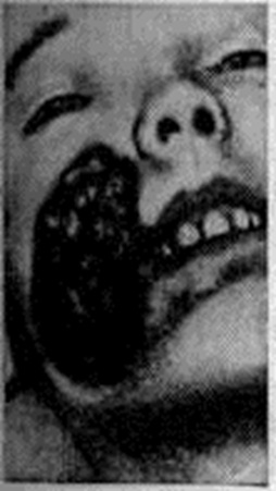 При микроскопическом исследовании в поражённых тканях видны аморфные массы детрита, среди которых часто встречаются кристаллы жирных кислот, гемосидерин, колонии различных микроорганизмов. В условиях эксперимента на лабораторных животных в стадии отёка номы наблюдают тромбоз капилляров с наличием иммунных комплексов в их эндотелии, выраженный отёк тканей, инфильтрацию лимфоидными и гистиоцитарными элементами. Клиническая картина. Особенно характерно Нома протекает на лице. Заболеванию часто предшествует язвенно-некротический стоматит или гингивит. На слизистой оболочке в углу рта появляется пузырёк с мутным или геморрагическим содержимым, а затем небольшое темно-синее некротическое пятно. Через 1—3 дня процесс начинает быстро распространяться и переходит на кожу, щеки, губы и подлежащие ткани; появляется различной степени отёчность всего лица. Вокруг очага кожа приобретает бледную восковую окраску с перламутровым оттенком (восковидная зона), по периферии кожа становится лоснящейся, стекловидной (стекловидный отёк). При пальпации в области отёка на коже остаются отпечатки пальцев. Воспалительная гиперемия отсутствует. В дальнейшем восковидная зона подвергается омертвению, процесс захватывает большие участки тканей (рисунок). Омертвевшие ткани издают резкий гнилостный запах. После удаления некротизировавшихся тканей из стенок раны выделяется мутная, с гнилостным запахом жидкость, кровотечение почти всегда отсутствует.