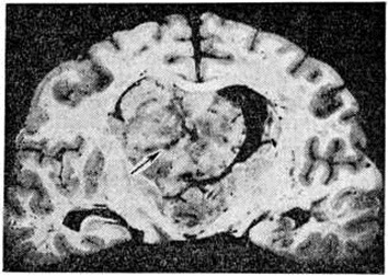 Макроскопически Олигодендроглиома имеет вид узла, чаще нечётко отграниченного от окружающего мозгового вещества (рисунок 1). Ткань опухоли однородного сероватого, серовато-розового, реже красноватого цвета, консистенция либо соответствует мозговому веществу, либо студенистая с наличием мелких кист.