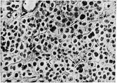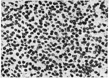 Микроскопически различают Олигодендроглиома типической и атипической структуры. Типические Олигодендроглиома состоят из густо и равномерно расположенных клеток со скудной цитоплазмой и ядрами сферической формы с нежными глыбками хроматина и чётким ядрышком (рисунок 2), напоминающих обычный олигодендроглиоцит. Нередко ткань опухоли приобретает мелкоячеистую (напоминающую соты) структуру, в центре ячейки располагается по нескольку ядер, окружённых светлой неокрашенной зоной (рисунок 3). Иногда в ткани Олигодендроглиома наряду с клетками, напоминающими олигодендроглиоциты, обнаруживают пучки веретенообразных клеток с отростками и ядрами вытянутой формы. В ряде случаев в Олигодендроглиома встречаются участки астроцитомы (смотри полный свод знаний), которая содержит глиальные волокна, импрегнирующиеся методом Рамон-и-Кахаля. Подобные опухоли диагностируются как олигодендроастроцитомы.. В Олигодендроглиома имеется небольшое или умеренное количество мелких сосудов. Характерным является отложение солей извести в ткани опухоли, сосудах и прилежащем мозговом веществе. Нередки мелкие кисты.