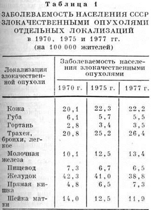 В экономически развитых странах Опухоли занимают второе место (15—23%, по данным ВОЗ) в общей структуре смертности, уступая смертности от сердечно-сосудистых заболеваний. Показатели смертности от злокачественных Опухоли на 100 000 населения в 1950 и 1976 годы составили в США соответственно 141,2 и 175,8, в Англии — 197,0 и 255,4, Японии — 78,9 и 125,3. Во всем мире ежегодно заболевает злокачественными Опухоли свыше 6,3 миллионов человек, а умирает от них не менее 4,3 миллионов человек Рост смертности от злокачественных Опухоли происходит в основном за счёт рака лёгкого, молочной железы и прямой кишки. Число онкологическое больных в СССР, как и во многих других экономически развитых странах, сохраняет тенденцию к росту, особенно среди мужчин. Мужчины в среднем в 1½ раза чаще, чем женщины, заболевают Опухоли лимфатической и кроветворной ткани, в 2 раза чаще — Опухоли желудка и пищевода и в 4½ раза чаще — Опухоли лёгких. Отмечается тенденция к снижению заболеваемости в СССР злокачественными Опухоли пищевода, желудка, шейки матки, однако нарастают показатели заболеваемости злокачественными Опухоли лёгких, молочной железы и прямой кишки (таблица 1). Рост смертности от злокачественных Опухоли в первую очередь может быть обусловлен резким снижением смертности от инфекционных, паразитарных и других болезней, а также постарением населения. Большое значение в изучении показателей смертности имеют общие для многих стран особенности её динамики. Анализ показателей смертности от онкологическое заболеваний за период с 1960 по 1978 год свидетельствует о том, что темпы её роста в СССР существенно замедлились. В 70-е годы заметно снизились показатели смертности от Опухоли пищевода и желудка, тогда как смертность от Опухоли лёгких, молочной железы, прямой кишки повысилась (таблица 2).