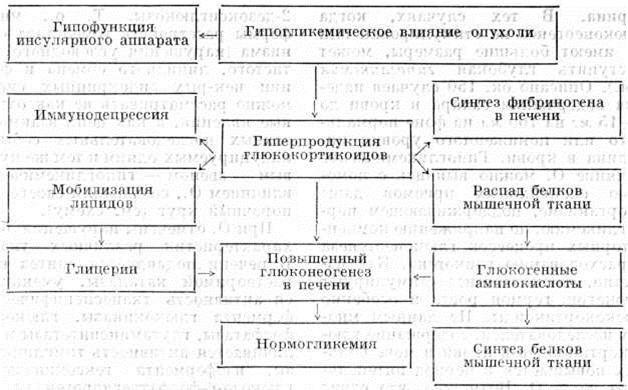 Пусковым звеном в расстройствах .гомеостаза, возникающих в организме при опухолевом росте, Служит гипогликемическое влияние опухоли. Оно вызывает гипофункцию инсулярного аппарата и стимулирует компенсаторные механизмы, обеспечивающие, как Правило, нормогликемию посредством гиперпродукции глюкокортикоидов которые стимулируют эндогенное образование глюкозы (глюконеогенез) из неуглеводных соединений (продуктов усиленного распада белков мышечной ткани — глюкогенных, аминокислот) и мобилизацию липидов С высвобождением глицерина. Гиперпродукция глюкокортикоидов вызывает также иммунодепрессию. Отвлечение части аминокислот в русло углеводного обмена нарушает синтез белков мышечной ткани, что наряду С другими изменениями приводит к мышечной дистрофии. У больных раком желудка, лёгкого, молочной железы по мере распространения процесса наблюдается прогрессирующее снижение уровня иммунореактивного инсулина в сыворотке крови и нарушение зависимости между продукцией гормона передней доли гипофиза и гормонов других желёз внутренней секреции. В частности, резкое снижение содержания трийодтиронина происходит на фоне повышенного уровня содержания в крови тиреотропного гормона. При раке тела матки, молочной железы и прямой кишки нагрузка глюкозой не снижает уровня содержания гормона роста в крови, а в некоторых случаях эта нагрузка вызывает даже парадоксальную реакцию — гиперпродукцию гормона роста. У больных злокачественными Опухоли различной локализации повышен порог чувствительности гипоталамогипофизарной системы, регулирующий секрецию адреналостероидов. Номенклатура, строение, классификацияВыделено большое количество отдельных форм Опухоли (в руководстве по патологоанатомической диагностике Опухоли под редакцией Н. А. Краевского и А. В. Смольянникова., 1976, упоминается около 500 различных форм Опухоли). В основу номенклатуры и классификации Опухоли положены гистогенетический и гистологический принципы, в связи с чем в названиях отражается их клеточная и тканевая принадлежность. Несмотря на значительный прогресс техники/ морфологический исследований, гисто и морфогенез некоторых Опухоли остаётся нераскрытым, что затрудняет их классификацию. Названия большинства Опухоли состоят из двух частей: в первой части содержится указание на источник развития опухоли (клетки, ткань, орган), второй частью является суффикс «ома», означающий опухоль. Например, опухоль, развивающаяся из жировой ткани, называется липомой, из хрящевой ткани — хондромой, мышечной ткани — миомой и тому подобное В наименовании Опухоли, помимо её гистогенетических особенностей, указывают на её связь с тем или иным органом (например, аденома щитовидной железы), или анатомической областью (например, липома бедра) и тому подобное В построении названий ряда Опухоли встречаются отклонения от указанного принципа; например, эпителиальная опухоль печени называется гепатомой, опухоль мозговых оболочек — менингиомой, опухоль вилочковой железы — тимомой и тому подобное Нередко в названии Опухоли подчёркивается её клеточный состав; например, опухоль из гистиоцитов называется гистиоцитомой, из клеток Лейдига — лейдигомой, из клеток Сертоли — сертолиомой. Опухоли, возникающие из . элементов кроветворной системы, получили специальные названия