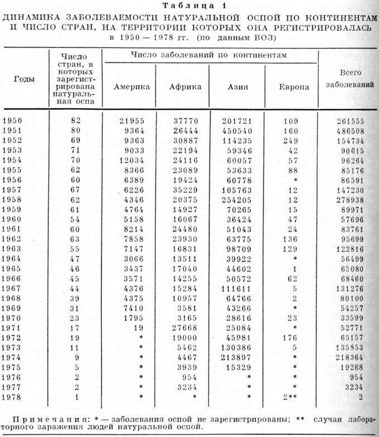 Считается, что в отдельные годы в Европе Оспа натуральная заболевало 10—12 миллионов человек, причём летальность составляла до 25—40%. Оспа натуральная уносила огромное число жертв, оставляла после себя большое количество слепых людей. Поворотным этапом в борьбе с Оспа натуральная явилось открытие Э. Дженнером оспенной вакцины (1796). Однако, несмотря на то, что противооспенная вакцинация стала известна человечеству ещё в конце 18 век (смотри полный свод знаний Оспопрививание), в литературе имеются чёткие указания, что даже в начале 20 век ни одна из вирусных инфекций не отличалась такой степенью распространённости, как оспа. Тем не менее с момента открытия I Международной санитарной конференции (1851) Оспа натуральная не фигурировала ни в повестке дня международных конференций, ни в сводке международных санитарный правил. И только в 1926 год на XIII Международной санитарной конференции делегат Японии предложил внести Оспа натуральная в список болезней, требующих обязательной декларации. Однако делегат Швейцарии возражал против этого предложения, мотивируя свою точку зрения тем, что Оспа натуральная существует везде: по-видимому, нет ни одной страны, о которой можно сказать, что она свободна от оспы. В процессе дискуссии конференция все же приняла решение о включении Оспа натуральная в число «конвенционных» болезней, однако обязательная декларация требовалась только в случае эпидемический вспышки, оповещение же об отдельных случаях Оспа натуральная считалось необязательным. Существование очагов Оспа натуральная в Азии, Африке и Южной Америке представляло потенциальную угрозу развития эпидемий при ослаблении предупредительных мер. Завоз Оспа натуральная в страны, свободные от этой инфекции, регистрировался ежегодно. В результате анализа эпидемический обстановки стало ясно, что ни одна страна мира в период бурного развития международных воздушных и других видов сообщений не гарантирована от завоза Оспа натуральная, а проведение карантинных мероприятий в условиях массового передвижения людей становилось все более сложным. Принимая во внимание изложенное, в 1958 год на XI сессии Всемирной ассамблеи здравоохранения (ВАЗ) советская делегация внесла предложение о ликвидации Оспа натуральная во всем мире. Обсудив предложение СССР, ассамблея единогласно приняла историческую резолюцию, провозгласившую проведение глобальной программы ликвидации оспы. В результате объединённых усилий всех стран мира Оспа натуральная была ликвидирована в Южной Америке в 1971 г., в Азии — в 1975 г., в Африке — в 1977 год Последний случай Оспа натуральная в мире был зарегистрирован в Сомали 26 октября 1977 год Официально победа над Оспа натуральная провозглашена на сессии Всемирной ассамблеи здравоохранения в мае 1980 г., на которой была отмечена роль СССР в этой победе. От имени европейского региона выступал академик Б. В. Петровский. Успешному осуществлению глобальной программы ликвидации Оспа натуральная способствовали: благоприятная обстановка в мире, когда благодаря блестящей победе Советского Союза и его союзников над фашизмом были созданы предпосылки для объединения усилий всех стран мира, направленных на борьбу с особо опасными инфекциями; координация всей работы по ликвидации Оспа натуральная единым центром, которым являлась ВОЗ; снабжение вс