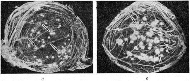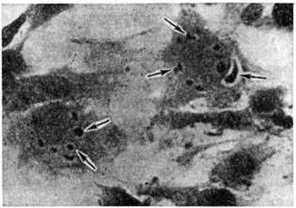 Из биологический методов используют выделение вируса на хорион-аллантоисной оболочке развивающегося куриного эмбриона. Заражают эмбрионы 12-дневного возраста, которых инкубируют после заражения в течение 48—72 часов при t° 34,5—35°. Наличие вируса Оспа натуральная определяется развитием на хорион-аллантоисной оболочке мелких до 1 миллиметров в диаметре белых, округлых, возвышающихся над окружающей непоражённой тканью оспин (рисунок 3, а). Указанные особенности образующихся на оболочке оспин отличают вирус Оспа натуральная от других ортопоксвирусов, в частности вируса осповакцины (рисунок 3, б), коровьей оспы, оспы обезьян и другие Метод выделения вируса на хорион-аллантоисной оболочке доступен большинству лабораторий. Выделение возбудителя можно проводить и на различных культурах клеток, в монослое которых вирус вызывает цитопатический эффект очагового типа и даёт феномен гемадсорбции. Специфичность цитопатического действия может быть проверена в тесте нейтрализации сывороткой к вирусу осповакцины, а также по наличию в инфицированных клетках цитоплазматических включений. При выделении вируса в культуре клеток, дифференциация вируса Оспа натуральная с другими ортопоксвирусами по характеру цитопатического действия затруднена. Выявление вируса (антигена) в культуре клеток может быть значительно ускорено при помощи флюоресцирующих антител (смотри полный свод знаний Иммунофлюоресценция) или иммунопероксидазной техники. Для этой цели инфицированные клетки обрабатывают флюоресцирующей противооспенной (для прямого метода) или антивидовой (для непрямого метода) сывороткой. Наличие антигена определяют по ярко-зелёному свечению цитоплазмы. При использовании иммунопероксидазной техники применяют соответственно меченные пероксидазой противооспенную или антивидовую сыворотки. В этом случае присутствие оспенного антигена проявляется темно-коричневым окрашиванием цитоплазмы клеток. Оба метода могут применяться и для выявления антигена в материалах от больных, если последний содержит неразрушенные клетки. Наиболее рациональным по быстроте и эффективности лабораторный исследованием для диагностики Оспа натуральная является сочетанное использование электронной микроскопии и выделения вируса на куриных эмбрионах. Первый из этих методов позволяет быстро установить, имеются ли в подозрительном материале вирионы поксвирусов или вирусов группы герпеса, а второй обеспечивает не только изоляцию возбудителя, но и его дифференциацию с другими ортопоксвирусами. При нечёткой картине поражений на хорион-аллантоисной оболочке куриных эмбрионов для внутригрупповой дифференциации ортопоксвирусов имеется ряд дополнительных тестов: заражение кроликов исследуемой культурой вируса (путём нанесения её на участок скарифицированной кожи); определение способности формировать оспины на хорион-аллантоисной оболочке куриных эмбрионов, заражённых культурой вируса и инкубируемых при t° 39,5°; установление наличия или отсутствия цитопатического действия и феномена гемадсорбции при заражении культурой вируса перевиваемой линии клеток почек эмбриона свиньи — СПЭВ-признак (таблица 2). Дифференциальный диагноз. Оспа натуральная дифференцируют с ветряной оспой (смотри полный свод знаний), импетиго, лекарственной сыпью (смот