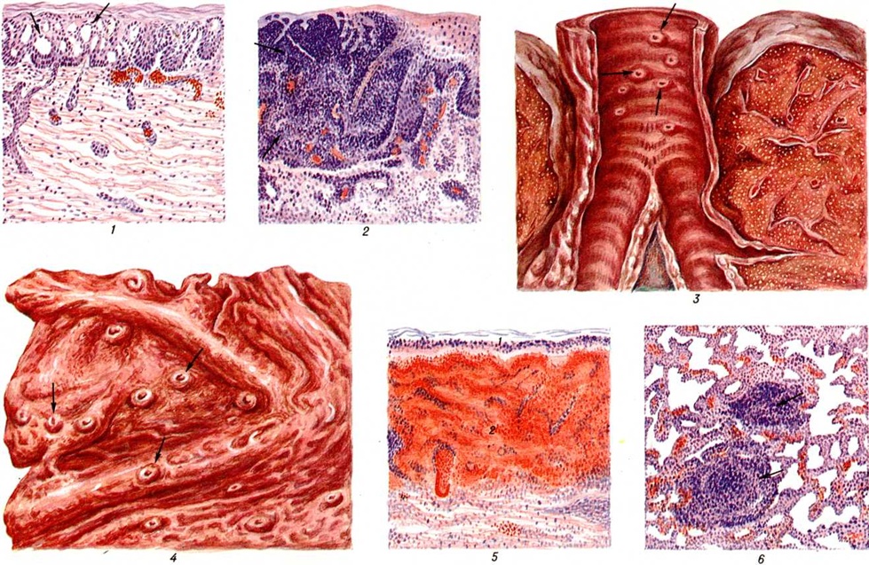 ПатогенезВирус проникает через слизистую оболочку носоглотки и верхних дыхательных путей, реже через кожу и попадает в регионарные лимфатических, узлы, в том числе и в глоточное лимфатических, кольцо, где и размножается. Возможно накопление возбудителя в лёгких. Через 1—2 дня первые генерации вируса попадают из этих органов в кровь — первичная, или малая, вирусемия (смотри полный свод знаний), откуда возбудитель диссеминирует в органы ретикулоэндотелиальной системы. Здесь происходит размножение вируса с вторичным выходом его в кровь — вторичная, или большая, вирусемия, этот процесс сопровождается появлением клинические, признаков болезни. Длительность этой фазы равна 5—10 суток За стадией вторичной вирусемии следует вторичная диссеминация вируса, особенно в эктодермальные ткани, предварительно сенсибилизированные при первичной вирусемии. Вирус легко адаптируется к эпителиальным клеткам кожи и слизистых оболочек, усиленно размножается, вызывая клинические, проявления в виде эволюционирующей мономорфной сыпи на коже со стадиями пятно — папула — везикула — пустула — язва — корочка — рубец, а на слизистых оболочках глаз, дыхательных путей, пищевода, мочевой системы, влагалища и заднего прохода со стадиями пятно — папула — везикула — эрозия. Вторичная вирусемия и вторичная диссеминация вируса приводит к выраженной интоксикации (смотри полный свод знаний), проявляющейся лихорадкой, головной болью, бессонницей, болями в мышцах и пояснице. Болезнь варьирует от лёгких форм (оспа без сыпи) до крайне тяжёлых с выраженным капилляротоксикозом и геморрагическими проявлениями. Важную роль играет присоединение вторичной инфекции (пневмонии и другие). Патологическая анатомияНаиболее ранние изменения в коже — расширение капилляров в сосочковом слое дермы, отёк и появление периваскулярной инфильтрации лимфоидными и гистиоцитарными клеточными элементами. Очень быстро присоединяются изменения в эпидермисе, которые выражаются в набухании эпителиоцитов и пролиферации клеток базального слоя. Нарастающий отёк и проникновение в толщу эпидермиса серозного экссудата приводят к возникновению мелких внутриэпидермальных пузырьков — баллонная дистрофия (цветной рисунок 1). Этот процесс сопровождается дискомплексацией и расслаиванием клеток с образованием эпителиальных тяжей, расположенных перпендикулярно к поверхности эпидермиса, в результате чего эпидермальный пузырёк бывает разделён на несколько камер. Явление это носит название ретикулярной дистрофии. Постепенно формируется большой многокамерный пузырь, который выглядит вначале как папула (смотри полный свод знаний), а затем как везикула (смотри полный свод знаний), возвышающаяся над кожей. Очень быстро в связи с нарастающими воспалительными явлениями в сосочковом слое дермы пузырёк заполняется лейкоцитами, экссудат становится серозногнойным и гнойным, образуется внутриэпидермальная пустула (цветной рисунок 2). В её центре быстро нарастают явления некробиоза, и наблюдающееся ранее небольшое западение усиливается, образуя типичное центральное западение. Некроз в центре пустулы (смотри полный свод знаний) сопровождается образованием корочек. Дном пустулы является инфильтрированный сосочковый слой дермы, однако в связи с тем, что базальный слой эпидермиса все