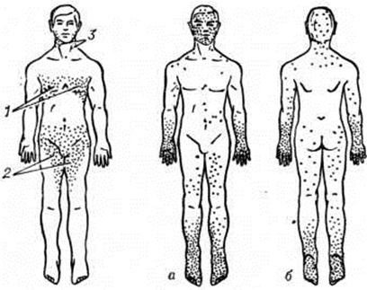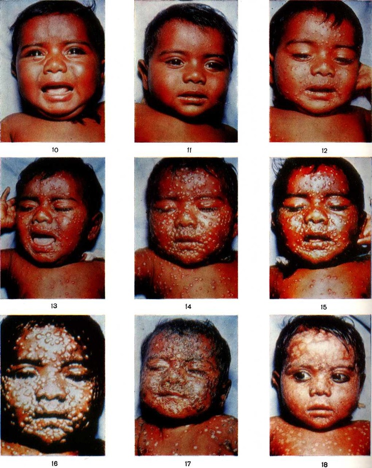 Кроме того, вирусы оспенной группы, генетически близкие к возбудителю Оспа натуральная человека, могут вызывать оспу у домашних и диких животных (обезьян, коров, лошадей, овец, коз, свиней, кроликов, птиц). Болезнь чаще вызывается специфическим для данного вида животных возбудителем. Однако известны случаи заболевания (например, у лошадей и других видов животных), вызванные возбудителем коровьей оспы. Человек восприимчив лишь к некоторым вирусам оспы животных (обезьян и коров). Вирус оспы обезьян был выделен в 1958 год в Копенгагене. Первый случай заболевания человека, вызванного этим вирусом, сопровождавшегося пустулёзными высыпаниями, не отличимыми от высыпаний при Оспа натуральная, был зарегистрирован в августе 1970 год в Республике Заир. За период с 1970 по 1980 год в Африке зарегистрирован 51 случай заболевания людей оспой обезьян. При этом от 29 больных выделен вирус оспы обезьян. По данным Бремена (J. G. Breman) и соавторами (1980), допускается возможность передачи возбудителя этой инфекции от человека человеку. Смотри полный свод знаний Поксвирусы. ЭпидемиологияИсточником инфекции является больной человек в течение всей болезни, от начала инкубационного периода до отпадения корочек. Источником инфекции может быть больной любой формой оспы, в том числе и оспы без сыпи. Период максимальной заразительности больного Оспа натуральная— с 3-го до 8-го дня после начала лихорадки. Заразительность больного зависит от степени и тяжести клинические, проявления болезни. Наибольшее эпидемиологические значение имеют больные тяжёлой формой болезни с обильными высыпаниями. При стёртых формах Оспа натуральная наблюдается значительное сокращение времени заразительности больного — иногда до нескольких часов. Вероятность передачи вируса зависит от частоты и степени контакта между больным и восприимчивым лицом. Степень защищённости от заболевания после вакцинации зависит от интервала между последней прививкой и контактом с больным. Хотя в оспенных корках содержится большое количество вирусов, наибольшее значение в распространении инфекции имеет выделение вируса из дыхательных путей. Основной путь передачи инфекции — воздушно-капельный. Рассеивание вируса с капельками слизи и слюны происходит при разговоре и особенно при чиханье и кашле. Вирус также может рассеиваться с частицами пыли при встряхивании инфицированного белья и одежды — воздушно-пылевой путь. Вследствие высокой устойчивости вируса Оспа натуральная в окружающей среде заражённые им вещи и предметы могут служить факторами передачи возбудителя при их пересылке на значительные расстояния (инфицированное белье, хлопок, ковры и так далее). Описаны случаи возникновения генерализованной оспы у лиц, принимавших участие во вскрытии трупов людей, умерших от Оспа натуральная, и обработке секционного материала. Известны случаи трансплацентарной передачи вируса. Описаны лабораторные заражения Оспа натуральная Хотя восприимчивость человека к Оспа натуральная считается абсолютной, наблюдения свидетельствуют, что при однократном общении с больным заболевает 35—40% лиц, не подвергавшихся ранее вакцинации и не болевших в прошлом Оспа натуральная Лицам, общавшимся с больным, вакцинация показана даже в том случае, если диагноз у первого заболевшего был установлен спустя несколько н