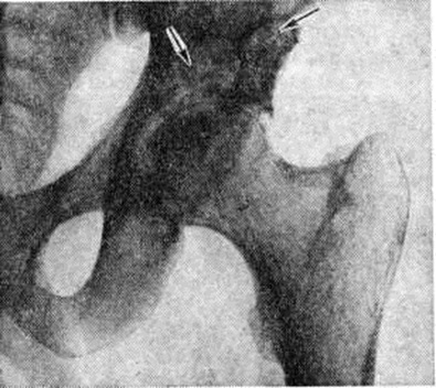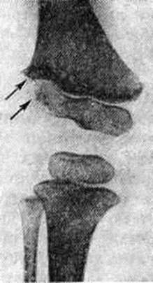 Формируются вальгусное или варусное искривление, патологический вывихи (смотри полный свод знаний), укорочение конечности, контрактуры (смотри полный свод знаний) и анкилозы суставов (смотри полный свод знаний Анкилоз). При остеоартрите исключительно важна ранняя диагностика; она основывается на типичном анамнезе и клинические, картине. Из специальных методов исследования практическое значение имеет определение внутрикостного давления, которое повышено с первых дней заболевания, ещё до появления чётких клинические, признаков гнойного процесса в кости. Первые рентгенологическое изменения появляются только через 10—15 дней от начала заболевания; поэтому установление диагноза лишь на основании рентгенологическое данных является запоздалым и чревато опасностью более тяжёлого течения болезни и более частого развития осложнений. Рентгенологические картина Остеоартрит характеризуется обязательным поражением как тканей самого сустава, так и околосуставных участков костей. Как правило, рентгенография производится в двух стандартных проекциях. В случае недостаточно убедительных данных прибегают к рентгенографии в дополнительных проекциях и к томографии (смотри полный свод знаний), которая позволяет выявить в кости даже мелкие деструктивные очаги. Туберкулёзный Остеоартрит диагностируется на основании регионарного остеопороза, околосуставного очага костной деструкции с неровными нечёткими контурами, сужения суставной щели вследствие разрушения суставных хрящей. В случаях поздней диагностики болезни обнаруживают контактную деструкцию в других костях, образующих сустав (рисунок 1). При туберкулёзном поражении крупного сустава первичный костный очаг на обычных рентгенограммах может не выявляться; его обнаруживают лишь с помощью томографического исследования. Диагностика туберкулёзного Остеоартрит должна подкрепляться характерной клинические, картиной и данными лабораторный исследований. Гнойный Остеоартрит рентгенологически диагностируют только в разгар болезни, на 2—3-й неделе от начала заболевания,— обнаруживают разрушение участка метафиза кости, полное или частичное исчезновение ядра окостенения эпифиза, нарушение нормальных взаимоотношений костей в суставе, утолщение мягких тканей сустава. При этом ранняя диагностика этого тяжёлого поражения (рисунок 2) должна базироваться на соответствующей клинические, картине и данных лабораторный исследований. Раневой (первично-суставной) Остеоартрит рентгенологически проявляется уменьшением ширины суставной щели вследствие разрушения суставных хрящей, появлением поверхностной деструкции в сочленяющихся костях на фоне нарастающего остеопороза, утолщением мягких тканей в области сустава. Процесс может протекать очень бурно, особенно у детей, и быстро закончиться костным анкилозом. Сходную рентгенологическое картину даёт гонорейный Остеоартрит, при котором в случае недостаточно активного лечения быстро (в течение 1½—2 недель) суживается суставная щель, вплоть до полного соприкосновения суставных концов костей. В результате развития поверхностной деструкции через 3—4 недель может образоваться костное сращение.