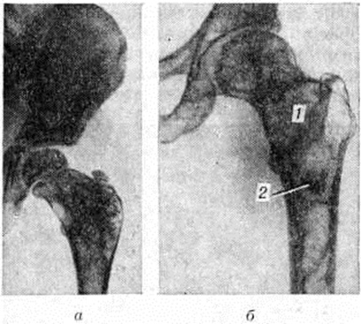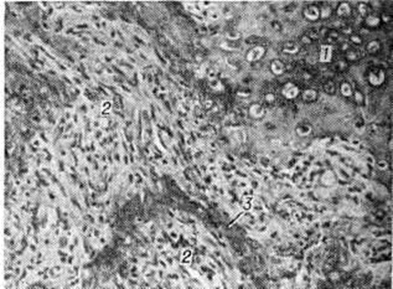 Смешанная фибрознохрящевая дисплазия. Наличие в костях, поражённых фиброзной Остеодисплазия, крупных участков хрящевой ткани (рисунок 3) даёт основания для выделения самостоятельной формы — фиброзно-хрящевой дисплазии. Клинические Картина в основном сходна с таковой при фиброзной остео дисплазии. В отдельных случаях наблюдается сочетание фиброзно-хрящевой дисплазии с синдромом Олбрайта (смотри полный свод знаний Лайтвуда—Олбрайта синдром). Рентгенологические картина при смешанной фиброзно-хрящевой дисплазии характеризуется деформацией костей (искривления и утолщения, нередко выраженные выбухания за счёт центрально и периферически расположенных патологический очагов). В очагах на фоне различной величины участков разрежения выявляются участки крапчатого и пятнистого обызвествления. Густота расположения очагов различная — от отдельных разбросанных очагов до массивных конгломератов. Корковый слой на уровне локализации патологический изменений истончается и иногда едва дифференцируется. В отличие от истинной фиброзной дисплазии при смешанной форме фиброзно-хрящевой дисплазии патологический очаги захватывают не только диафизы и метадиафизы, но и метаэпифизарные отделы костей. Наряду с трубчатыми поражаются плоские, губчатые и короткие трубчатые кости (рисунок 4 и 5, а, б). Лечение больных определяется характером деформаций костей, степенью статико-функциональных нарушений. Рекомендуются различные виды резекции поражённого отдела кости с последующей ауто и аллопластикой (смотри полный свод знаний Костная пластика), корригирующие остеотомии (смотри полный свод знаний). Кюретаж очагов менее эффективен в связи с возможными рецидивами. Плеоностеоз (pleonosteosis), описанный Лери (A. Leri), встречается крайне редко. Это наследственное заболевание, которое характеризуется симметричным поражением диафизов и эпифизов трубчатых костей в виде гиперостоза (смотри полный свод знаний). Особенно резко утолщаются пястные, плюсневые кости и фаланги. Задерживается рост скелета. Кости конечностей укорачиваются. Нарушается абдукция, пронация и сгибание в суставах. Коленные суставы находятся в вальгусном положении. Выражен поясничный лордоз (смотри полный свод знаний). Грудная клетка деформируется за счёт уплощения и утолщения рёбер и выбухания грудины. На рентгенограммах видно, что поражённые кости деформированы: они утолщены и укорочены, корковый слой их расширен, гипертрофирован. Периостальная реакция отсутствует. Виден груботрабекулярный рисунок структуры костей. Метафизы широкие, зона предварительного обызвествления неровная, неоднородной плотности. Эпифизы уплощены, с неровными чёткими очертаниями. Лечение состоит в исправлении грубых деформаций скелета с помощью соответствующих ортопедических операций (смотри полный свод знаний Костная пластика, Остеотомия).