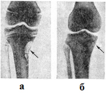 Фиброзный кортикальный дефект появляется в постнатальном периоде и бывает связан с повышенной статикофункциональной нагрузкой на определённый сегмент кости. Развитие фиброзных кортикальных дефектов характерно для детей со статико-функциональными нарушениями опорно-двигательного аппарата (сколиоз, плоскостопие, варусная и вальгусная деформация коленных и тазобедренных суставов и другие). Фиброзный кортикальный дефект проявляется развитием локальной зоны дегенеративно-дистрофической перестройки обычно в метафизарных отделах длинных трубчатых костей, у мест прикрепления связок и сухожилий. Очаг может быть одиночным, но нередко очаги возникают одновременно или последовательно в нескольких костях (например, на медиальной поверхности дистального метафиза бедра и медиально-задней поверхности большеберцовой кости). Возможно развитие фиброзных кортикальных дефектов в костях разных конечностей. Значительно реже очаги выявляются в субпериостальных отделах седалищной кости, лопатки и ключицы. Микроскопически очаг поражения представлен пучками коллагеновых волокон и вытянутых клеток фибробластического типа, среди которых можно встретить многоядерные гигантские формы. Для клинические, картины фиброзного кортикального дефекта характерно медленное нарастание локальных болей и ограниченная припухлость мягких тканей. Нередко патологический процесс протекает бессимптомно, а очаги поражения обнаруживают случайно, при проведении рентгенологическое исследований по другому поводу. Рентгенологические исследование почти всегда позволяет поставить правильный диагноз. Наблюдается характерное метафизарное расположение очагов. Очаги никогда не распространяются через зону метаэпифизарного росткового хряща на эпифиз. Фиброзный кортикальный дефект располагается в толще коркового слоя субпериостально и является краеобразующим. Он имеет сравнительно правильную овоидную или округлоовальную форму и всегда локализуется вдоль оси кости. Возможно истончение и незначительное вздутие прилежащего участка коркового слоя. Очертания кортикального дефекта чёткие, ровные или полициклические, фестончатые. Чаще всего структура очага равномерно прозрачная, иногда мелко или крупноячеистая. Со стороны прилежащих отделов очаг отграничен ободком остеосклероза (рисунок 6). Иногда на уровне кортикального дефекта определяется поперечно-расположенная лоозеровская зона (смотри полный свод знаний Лоозера зоны). Яффе (Н. L. Jaffe) и Л.. Лихтенстайн расценивают фиброзный кортикальный дефект как изолированную форму фиброзной Остеодисплазия, которая подвергается самопроизвольному обратному развитию или стабилизируется, но в отдельных случаях может переходить в опухолевый процесс. Для фиброзных кортикальных дефектов характерно самопроизвольное излечение, которое обычно наступает через 1½—2 года (рисунок 7). При более длительном восстановлении костной структуры показана краевая резекция поражённой кости. Фиброзные кортикальные дефекты следует дифференцировать с туберкулёзным оститом (смотри полный свод знаний Туберкулёз нелёгочный, туберкулёз костей и суставов), хондромиксоидной фибромой (смотри полный свод знаний), эозинофильной гранулемой костей (смотри полный свод знаний), изолированной кистой кости, остеоид-остеомой (смот
