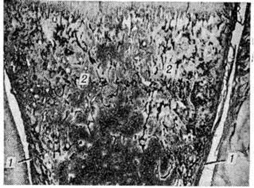 Гистохимические исследования свидетельствуют о том, что коллагеновые волокна при Остеогенез несовершенный имеют необычно высокое содержание пролина и что такой коллаген угнетает in vitro процессы кальцификации, хотя определяемые светооптически процессы минерализации кости при Остеогенез несовершенный остаются неизмененными. Патологическая анатомия. При Остеогенез несовершенный у детей и у взрослых в костях обнаруживают одинаковые изменения. Различны лишь масштабы, глубина и локализация поражения костей. Макроскопически у новорожденных обнаруживают старые сросшиеся внутриутробные переломы рёбер и длинных трубчатых костей в сочетании с псевдоартрозом (смотри полный свод знаний Ложный сустав) и свежими переломами (смотри полный свод знаний), возникшими во время родов. Сросшиеся переломы хорошо заметны из-за резкой деформации, искривления костей и наличия крупных хрящевых мозолей. Переломы могут быть обнаружены макроскопически во всех костях скелета. Исключением являются стопы и кисти, в костях которых можно обнаружить следы старых и свежие микропереломы только при тщательном микроскопическом исследовании. Особенностью большинства переломов является отсутствие обширных кровоизлияний и перифокальной воспалительной инфильтрации мягких тканей, что в основном и определяет свойственную им безболезненность. Весьма характерны изменения костей крыши черепа, представляющих собой нередко тонкую фиброзную пластинку с заключёнными в ней островками костной ткани в виде перекладин. Такие изменения костей черепа, как правило, несовместимы с жизнью вследствие тяжёлой травматизации головного мозга в родах. При позднем Остеогенез несовершенный макроскопически определяют обилие старых заживших переломов трубчатых костей и ложных суставов, а также значительные искривления позвоночника, костей таза и конечностей, обусловленные не только неправильным сопоставлением костных отломков в процессе заживления перелома, но и приспособительной перестройкой костей в условиях изменённой статической нагрузки. Например, при невозможности к передвижению в вертикальном положении больные приспосабливаются передвигаться на четвереньках или ползком, что приводит к значительному искривлению трубчатых костей верхних и нижних конечностей, а также костей таза. Кости отличаются необыкновенной хрупкостью и легко режутся ножом. На распилах длинных трубчатых костей корковое вещество резко истончено (рисунок 1), поэтому их костномозговая полость выглядит непропорционально широкой. А. В. Русаков обращал внимание на своеобразную форму черепа при позднем Остеогенез несовершенный: сравнительно слабо развитую лицевую его часть и крупные шаровидной формы мозговые отделы. Эти изменения нередко сочетаются с расширением боковых желудочков мозга, выбуханием из глазниц глазных яблок (глаза навыкате) и необычной круглоголовостью в сочетании с водянкой желудочков мозга. Микроскопически при врождённом и позднем Остеогенез несовершенный обнаруживают однотипные изменения: недостаточное развитие основного вещества (рисунок 2) во всех костях, развивающихся как на хрящевой, так и на соединительнотканной основе. Эпифизарные хрящи имеют нормальную структуру, зона предварительного обызвествления хряща и зона его рассасывания имеют обычные к