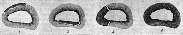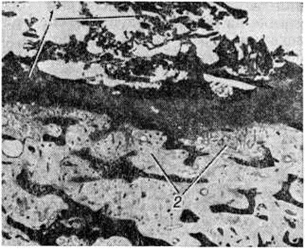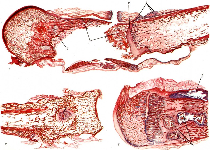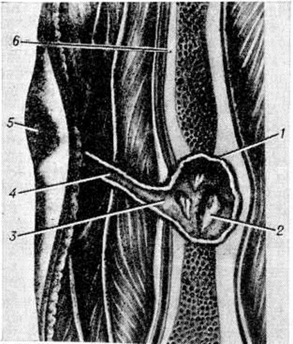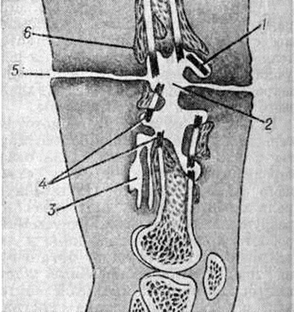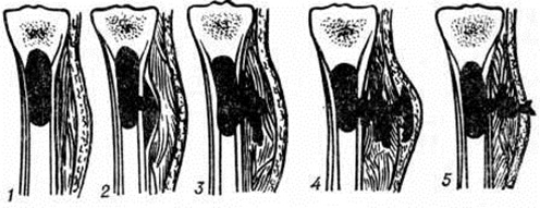 Воспаление начинается в мягких тканях краёв раны в виде диффузной воспалительной инфильтрации, вслед за которой на границе с зоной омертвения формируется демаркационная линия. Одновременно образуется экссудат, поступающий в полость раны и пропитывающий некротизированные ткани, подвергающиеся при этом расплавлению, а часто и гнилостному распаду. К 4— 5-му дню в зоне демаркационной линии образуются грануляции, обильно продуцирующие гной. К этому сроку проявляется и гнойное воспаление в отломках кости, которое протекает на границе с некротизированными тканями, сохраняя характер демаркационного. С началом нагноения омертвению могут подвергнуться связанные с периостом костные осколки и мягкие ткани, испытавшие коммоцию — зона резерва некроза по И. В. Давыдовскому. Очаг нагноения постепенно изолируется валом из грануляций, а в последующем и соединительнотканной капсулой. В нем располагаются свободные костные осколки, не удалённые при хирургической обработке раны, осколки, сохранившие связь с периостом, концы отломков, лишённые периоста, инородные тела, обрывки мягких тканей, распадающиеся кровяные свёртки (рисунок 3). Нагноение нередко распространяется в глубь мягких тканей и в толщу кости вдоль трещин и каналов, проделанных сместившимися в момент ранения костными осколками, что придаёт очагу сложные очертания (цветной рисунок 1). В ходе нагноения происходит расплавление омертвевших тканей под действием ферментов гноя и выделение их из раны, а также секвестрация омертвевших участков кости, находящихся в очаге нагноения. Темпы секвестрации снижаются при обширном параоссальном нагноении, задержке гноя в ране, тяжёлой интоксикации. В ходе нагноения в окружающих очаг тканях развёртываются пролиферативные и дистрофические процессы. В результате пролиферации тканей возникает гноеродная оболочка, а затем формируется костная мозоль (смотри полный свод знаний) с последующей консолидацией перелома или образуются лишь костные разрастания по краям отломков (рисунок 4). Возникшая костная мозоль включает в себя гнойники с секвестрами (цветной рисунок 2) и играет т. о. роль секвестральной капсулы, из которой свищевые ходы ведут на поверхность кожи (рисунок 5). Дистрофические изменения выражаются в диффузной рарефикации, а позже в очаговой эбурнеации кости (смотри полный свод знаний) в зоне образования мозоли. В окружающих мягких тканях и в соседних суставах развиваются явления атрофии. Обострение гнойного процесса возможно на любом этапе, в том числе и спустя многие годы и даже десятилетия. В результате в кости и в мягких тканях могут возникнуть очаги флегмоны (смотри полный свод знаний), так называемый сочувственный артрит, тромбофлебит, гнойные затеки (смотри полный свод знаний). Отличительной особенностью огнестрельного Остеомиелит губчатых костей является слабое отграничение гнойных очагов, часто с неуклонным прогрессированием процесса, и скудное мозолеобразование. Помимо типичной формы огнестрельного Остеомиелит, в тяжёлых случаях, особенно при слепых осколочных ранениях эпифизов и губчатых костей, возникает флегмонозный Остеомиелит (некрофлегмона костного мозга), распространяющийся на большие участки кости без тенденции к отграничению. Он характеризуется некрозом поражённых тканей, гнойным тромбофлебитом и а