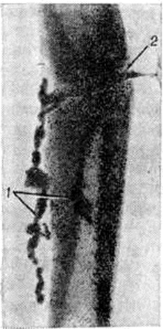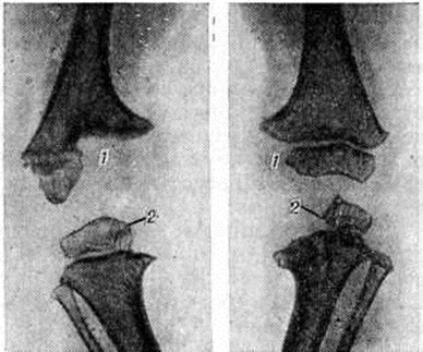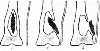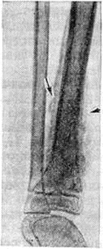 Токсическая (адинамическая) форма гематогенного Остеомиелит встречается у 1—3% больных. Заболевание развивается молниеносно. В течение первых суток нарастают явления тяжёлого токсикоза: гипотермия, менингеальные симптомы, потеря сознания, судороги, сменяемые адинамией; развивается острая сердечнососудистая недостаточность, снижается АД. Местные воспалительные явления проявиться не успевают: больные погибают в первые дни болезни в результате глубоких метаболических нарушений. Осложнения. Наиболее характерным и тяжёлым осложнением острого гематогенного Остеомиелит является сепсис (смотри полный свод знаний), который особенно часто развивается при запоздалом или неправильном лечении заболевания. Гнойный артрит прилежащих суставов в одних случаях возникает гематогенно, одновременно с очагом воспаления в кости в результате генерализации септического процесса, в других — вследствие распространения инфекции из костного очага по лимфатических, путям или прорыва гноя из кости в полость сустава. У 8— 10% больных (при септико-пиемических формах — у 30%) возникают метастатические гнойные очаги во внутренних органах с развитием септической пневмонии, гнойного плеврита, перикардита, миокардита, абсцесса мозга и другие Патологический перелом кости, в том числе эпифизеолиз (смотри полный свод знаний Переломы), возникает в результате разрушения кости, нередко с исходом в ложный сустав (смотри полный свод знаний). Эпифизарный и метафизарный Остеомиелит вследствие близкого расположения очага к ростковой зоне может приводить к нарушению роста и значительным деформациям костей (искривлению, укорочению, реже удлинению), патологический вывиху (смотри полный свод знаний), контрактурам.) или анкилозу (смотри полный свод знаний). Диагноз. Характерный анамнез и типичная клинические, картина местной формы гематогенного Остеомиелит (стойкая высокая температура тела, резкие боли в области поражения кости, нередко присоединение явлений острого артрита) помогают поставить диагноз. Раннее распознавание септико-пиемической формы связано с известными трудностями в связи с преобладанием общих симптомов над мало выраженными начальными местными, особенно у маленьких детей. Нередко в качестве первичного диагноза фигурируют травма, ревматизм, пневмония, скарлатина и другие От ошибок могут предохранить тщательная пальпация и проверка подвижности конечностей, позволяющие выявить болевую зону, наличие отёка, ограниченную подвижность в суставе, защитную контрактуру. Основным ранним симптомом местной и септико-пиемической форм гематогенного Остеомиелит является боль в конечности, усиливающаяся при движениях, нагрузке по продольной оси, пальпации и перкуссии. Путем пальпации можно определить усиленную пульсацию магистральной артерии (плечевой или бедренной), а при надавливании на них — выраженную болезненность. Обязательны повторные посевы крови на содержание в ней бактерий. Отсутствие местных симптомов и быстрое течение токсической формы Остеомиелит создают большие трудности для своевременной диагностики. Большую ценность для диагностики представляет рентгенологическое исследование. Наиболее ранним косвенным рентгенологическое признаком острого Остеомиелит является утолщение и деформация мягких тканей, окружающих кость, 