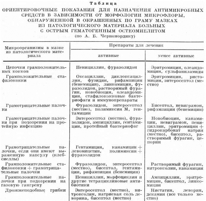 При остеомиелите плоских и малых трубчатых костей, рёбер, малоберцовой кости производят резекцию кости в пределах неизменённых тканей. В случаях, когда кортикальный секвестр находится в мягких тканях, а рентгенологически достоверно не установлено наличие деструктивных изменений в костной ткани, операция ограничивается иссечением свища и удалением секвестра без трепанации кости. При посттравматическом хронический Остеомиелит, осложнённом псевдоартрозом, некрэктомию (смотри полный свод знаний) можно дополнить резекцией ложного сустава с последующей репозицией отломков и наложением аппарата для внеочагового компрессионного остеосинтеза (смотри полный свод знаний Дистракционно-компрессионные аппараты). При рецидиве хронический Остеомиелит и наличии указаний на развитие флегмоны показано срочное широкое вскрытие и дренирование остеомиелитической полости в кости. Из осложнений, связанных с оперативными вмешательствами, встречаются обильные кровотечения из костной полости, некроз мышечного лоскута, использованного для пластики костной полости, нагноение гематом в области оперативного вмешательства, некроз кожных лоскутов, выкраиваемых для прикрытия костной ткани. Антимикробная терапия является важным компонентом лечения хронический Остеомиелит, поскольку как бы тщательно ни проводилась радикальная операция, она одна не способна обеспечить стерильность остеомиелитического очага. Поэтому наряду с оперативным проводят интенсивное противомикробное лечение, в ходе которого руководствуются следующими правилами: при назначении антибиотиков обязательно учитывают чувствительность к ним микрофлоры больного, предпочтение отдают при прочих равных условиях антибиотикам с повышенной тропностью к костной ткани (линкомицин, морфоциклин и тому подобное); нельзя нарушать режим антибиотикотерапии как в течение суток, так и в период всего курса лечения, так как это способствует развитию антибиотикорезистентной микрофлоры и снижает эффективность лечения; необходимо регулярно проводить повторные исследования раневого отделяемого на микрофлору и проверять чувствительность её к антибиотикам, внося в лечение необходимые коррективы; для создания высокой терапевтической концентрации антибиотиков в зоне операции пользуются различными путями введения антибиотиков, в том числе внутривенным, внутрикостным, регионарным внутриартериальным; для более эффективного подавления патогенной микрофлоры рекомендуется одновременно применять различные антибиотики и сочетать с ними введение других антимикробных препаратов (сульфаниламидов, нитрофуранов и другие) и иммунных средств. Иммунотерапия хронический Остеомиелит проводится с учётом того, что в подавляющем большинстве случаев возбудителем заболевания является патогенный стафилококк в виде монокультуры или в ассоциации с другими гноеродными микробами. Поэтому основными в иммунотерапии являются специфические антистафилококковые иммунные препараты, в частности стафилококковый анатоксин, стафилококковый бактериофаг. В пред и послеоперационном периодах показано проведение курса инъекций стафилококкового анатоксина. Стафилококковый бактериофаг, лизирующий патогенные стафилококки, применяют местно и парентерально. В предоперационном периоде его исполь