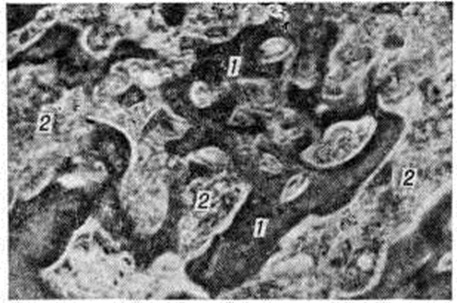 Установление преобладающего механизма развития анемии при остеомиелите имеет практическое значение, так как определяет ведущее направление лечения. Патологическая анатомия. Патологоанатомическая картина характеризуется спленомегалией (смотри полный свод знаний), гепатомегалией (смотри полный свод знаний Печень), гиперплазией костного мозга (смотри полный свод знаний) и лимфатических узлов (смотри полный свод знаний), редко и в меньшей степени уплотнением и склерозом трубчатых и губчатых костей (смотри полный свод знаний Остеосклероз). Макроскопически на распилах костей наблюдают неравномерное расположение и резкое утолщение костных перекладин, вытесняющих кроветворный костный мозг. В эпифизах трубчатых костей отмечают утолщение и однородность коркового вещества, костные перекладины могут заполнять костномозговую полость. Дистальные отделы кости поражаются реже, но могут встречаться периостальные костные разрастания. Микроскопически в костях обнаруживают увеличение числа широких диффузно-волокнистых костных перекладин (рисунок 1), бедных остеоцитами, с участками обызвествления. Соотношения между зрелой и новообразованной костью различны. Костномозговые полости заполнены хаотично расположенными костными перекладинами разной ширины, в которых встречаются крупные остеоциты. В компактном веществе наблюдается расширение центральных (гаверсовых) каналов, просветы которых заполнены вновь образованными костными перекладинами. Коллагеновые волокна представлены длинными или короткими извитыми тяжами, среди которых встречаются группы гигантских клеток с крупными ядрами или многоядерные клетки, трудно отличимые от мегакарноцитов. Сохранившиеся костномозговые полости заполнены жировым костным мозгом.